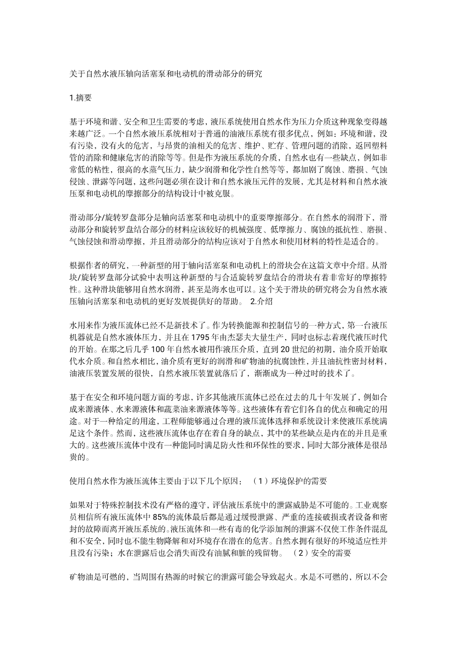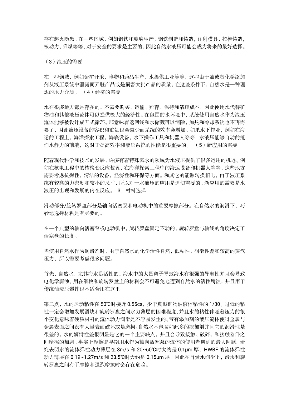 1. As concerns for environmental compatibility, safetyand hygienic requirements, hydraulic systems using rawwater as pressure medium become more and moreattractive. A raw water hydraulic system has many advantages over conventional oil hydraulic systems,such as: environmentally compatibility, no pollution and no fire hazard, elimination of expensive oils with the associated problems of contamination, maintenance,storage, handling, elimination of the return hose, and elimination of health hazards, etc. But as a hydraulic medium, raw water has also drawbacks, such as very low viscosity, high vapor pressure, lack of lubrication and chemically active nature, etc., that all tend to promote problems of corrosion, wear, cavitation erosion, leakage, and so on, those problems must be overcome in the design and development of the raw water hydraulic components, especially the selection of materials and design of structure for the friction pairs in raw water hydraulic pumps and motors.