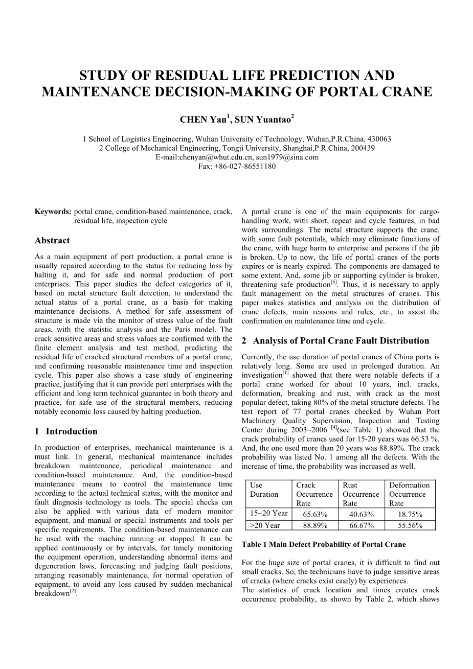 摘要:门式起重机作为港口生产的主要设备,通常按停机状态进行修理,以减少港口的损失,保障港口企业的安全和正常生产。本文基于金属结构故障检测技术,研究了其缺陷类别,了解了门式起重机的实际状况,并以此作为制定维护决策的基础。通过监测断层应力值,用统计分析和巴黎模型的方法进行结构安全评价。裂纹敏感面积和应力值用有限元分析法和试验法确定,预测门式起重机开裂结构件的剩余寿命,并确认合理的维护时间和检查周期。本文还展示了工程实践的案例研究,证明它能为港口企业在理论和实践中提供有效和长期的技术保证,能够安全使用结构件,减少特别是因停产而造成的经济损失。