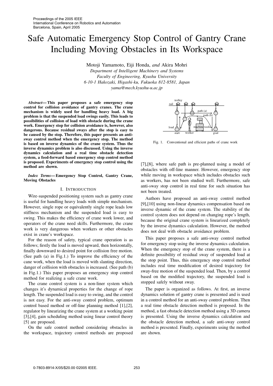 出于安全原因,典型的起重机操作如下:(见图1中的路径(a))为了提高装载甘蔗的工作效率,当负载以倾斜的方向移动时,与障碍物发生碰撞危险的可能性增加。(参见图1中的路径(b))。本文提出了一种用于实现起重机安全工作的紧急停止控制方法。