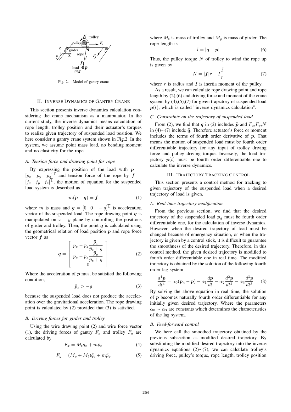 本节介绍逆动力学计算,将起重机机械作为操纵器。在当前的研究中,逆动力学意味着对绳长度,手推车位置和它们的致动器的扭矩的计算,以实现悬吊载荷位置的给定轨迹。 我们在这里考虑一个龙门起重机系统如图2所示。在系统中,我们假设点质量负载,没有弯矩和没有弹性的绳索。