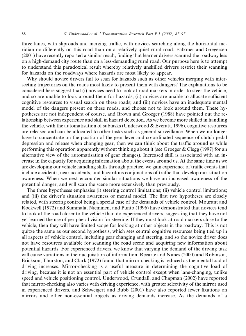 相对于在有经验的驾驶员中观察到的扫描,新手驾驶员倾向于限制他们在双车道上的道路搜索. 本研究确定了这种差异的原因,是否在于在车辆控制保持之后,新手限制了剩余的心理能力, 又或者是在于在双车道上发生守望事件的一种可能的贫乏心理模型造成的。新手驾驶员和经验丰富的司机观看从沿着各种道路(包括双车道)行驶的一辆汽车上拍摄的录像, 并记录当他们遵循表明危险事件的指示时,他们眼睛的运动来确定扫描模式,因为它们遵循指示危险事件的指示. 有经验的驾驶员在这项任务中对双车道的要求部分展示了更广泛的扫描. 结果支持了这样的假设:新手进行道路扫描是有限制的,这不是由于他们在车辆控制任务下具有有限的心理资源剩余,而是由于他们有一个可能发生在双车道的贫乏心理模型。 2002 Elsevier Science Ltd. 2002 爱思唯尔科学有限公司 。All rights reserved.版权所有