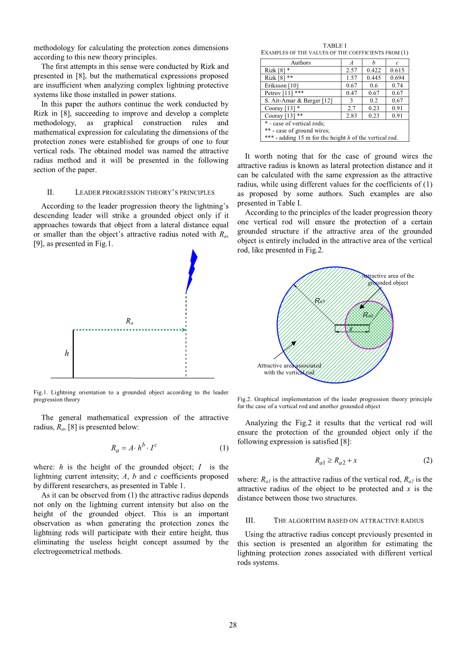 值得注意的是,对于地线来说,吸引半径被称为横向保护距离,它可以用与吸引半径相同的表达式来计算,同时使用一些作者提出的系数(1)的不同值。表一也列出了这些例子。