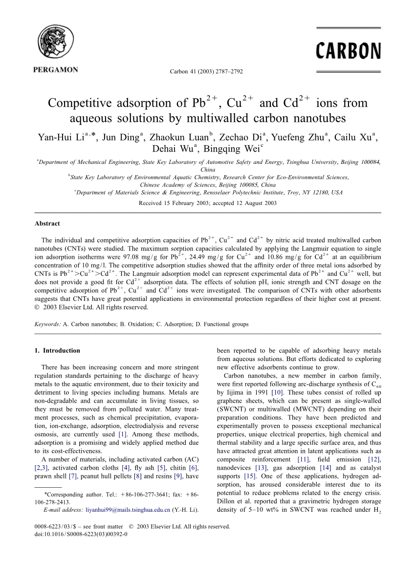 Yan-Hui Li a,*, Jun Dinga , Zhaokun Luanb , Zechao Di a, Yuefeng Zhu a, Cailu Xua , Dehai Wua , Bingqing Weic