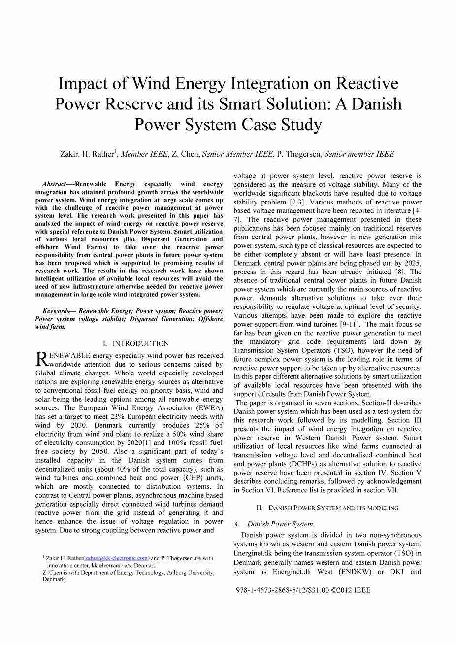 再生能源尤其是风力发电受全球关注由于全球气候变化引起的严重担忧。整个世界特别是发达国家正在优先考虑替代传统化石燃料能源的可再生能源,风能和太阳能是所有可再生能源的主要选择。欧洲风能协会(EWEA)的目标是到2030年满足23%的欧洲电力需求。丹麦目前生产25%来自风力的电力和计划实现了50%的风力发电份额到2020年的电力消耗[1]和100%的化石燃料自由社会到2050年。丹麦系统今天装机容量的一大部分来自分散机组(约占总容量的40%),例如风力发电机组合和热电联产(CHP)单元,其主要与配电系统相连。与中央发电厂相反,基于异步电机的发电,特别是直接连接的风力发电机,无需生成电力,就需要无功功率,从而增强电力系统的电压调节问题。由于无功功率之间的强耦合和电力系统电压,无功功率储备被认为是电压稳定性的测量。由于电压稳定性问题,许多全球重大的停电已经导致[2,3]。已有文献报道了各种基于无功功率的电压管理方法[4-7]。这些出版物中提出的无功功率管理主要集中在中央发电厂的传统储量,然而在新一代混合动力系统中,这种经典资源预计完全不存在或者存在最少。在丹麦,中央发电厂正在逐步淘汰到2025年,这方面的进程已经开始[8]。 目前丹麦无功电力系统的主要来源是传统的中央发电厂,目前是无功电力的主要来源,需要替代解决方案来承担起在最佳安全级别调节电压的责任。已经进行了各种尝试来探索风力发电机的无功功率支持[9-11]。 迄今为止,主要关注的是无功发电,以满足传输系统运营商(TSO)制定的强制电网规范要求,然而,未来复杂电力系统的需求在无功功率支持方面起主导作用 被替代资源所占用。