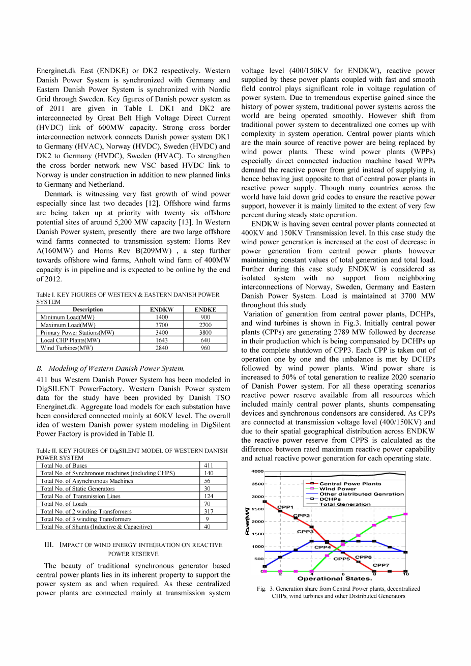 摘要-可再生能源,特别是风能一体化在世界电力系统范围内实现了深刻的增长。风能在大规模集成提出了电力系统无功功率管理的挑战。本文中给出的研究分析了风能对无功功率的影响保留丹麦电力系统与特殊的参考。聪明的利用各种本地资源(如分散发电和海上风力发电场)接管中央发电厂的无功功率的责任通过研究及结果提出了未来电力系统所支持的承诺。这个研究的结果表明智能利用可用的本地资源将避免的需要新的基础设施,否则所需无功功率管理大规模风能电力系统集成。