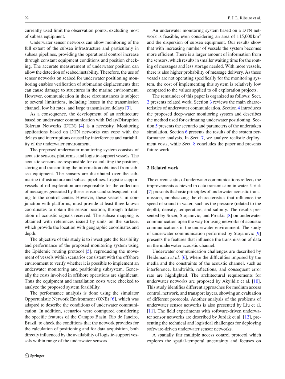 本文的其余部分组织如下:教派。2介绍相关工作。第3reviews水声通信的主要特点。第4节介绍了建议的深水监测系统,并介绍了用于估计水下定位的方法。第5节介绍了所进行的模拟的方案和参数。第6节介绍了系统性能分析的结果。在教派。7,我们分析现实部署成本,而教派。8总结的文件,并提出今后的工作。