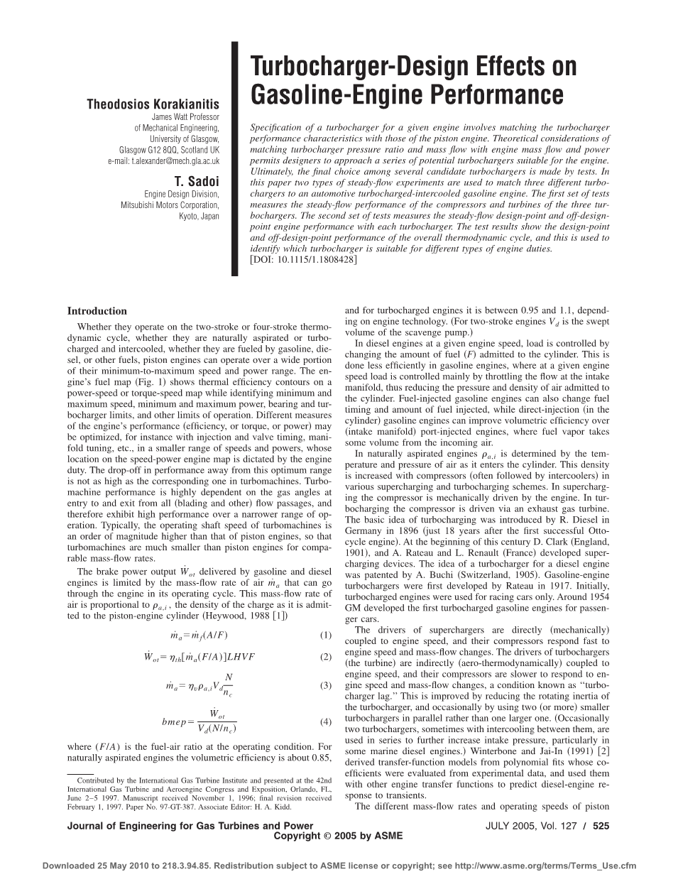 用于给定发动机的涡轮增压器的规格涉及到涡轮增压器与发动机性能的匹配。使涡轮增压器增压比和质量流量与发动机的质量流量和功率相匹配的理论考虑使得设计者可以选择一系列适合于发动机的潜在的涡轮增压器。最终,通过测试,在几个待定的涡轮增压器中做出选择。在本文中,使用两种类型的稳定流实验来将三种不同的涡轮增压器同中冷式涡轮增压汽油机进行匹配。第一组测试是测量三个涡轮增压器的压气机和涡轮机的稳定流动性能。第二组测试测量每个涡轮增压器的稳定流量在设计点与非设计点下的发动机性能。测试结果显示了整个热力循环在设计点和非设计点的性能,这被应用于识别哪种涡轮增压器可以适用于不同的发动机负荷。