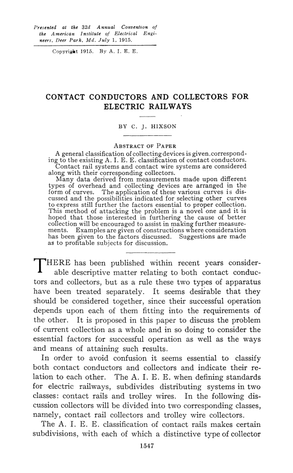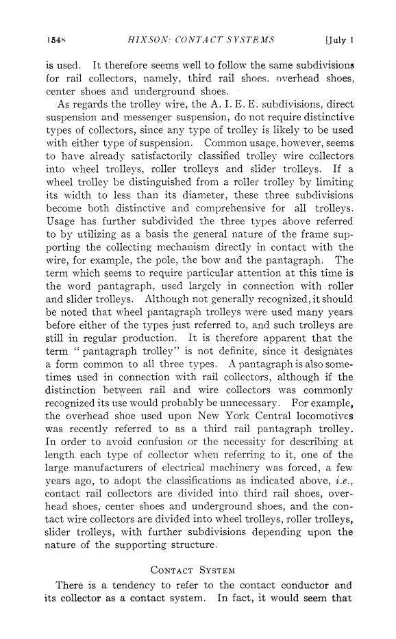 为了避免混淆,似乎必须对接触导体和收集器进行分类,并指出它们之间的关系。 A.I.E.E.E. 在制定电气铁路标准时,将系统分为两类:接触轨和电车线。在下面的讨论中,收藏家将分为两个相应的类别,即接触轨道收集器和电车线收集器。