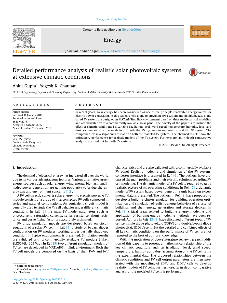 光伏方阵的仿真模型是基于单个太阳光伏电池的同等电路形成的。文献[4]中有一个在仿真环境中对工作于部分遮光条件下的光伏组件中旁路二极管配置的研究。仿真结果用市售的光伏组件Siliken SLK60P6L (209 Wp)来验证。在文献[5]中讲到了Matlab/Simulink环境中光伏电池的两种不同仿真模型的开发。两者是在各自的P-V和I-V特性基础上比较并也用了市售的光伏组件加以验证。文献[6]介绍了光伏发电系统的转换接口的现实建模和仿真。作者讨论了关于光伏电池建模的主要问题和它们的现有解决方案。光伏电池的动态模型需要得到一个运行状态下的实际图像。文献[7]介绍了一个以试验数据为基础的发电机组的光伏系统的动态模型。文献[8]的作者提出开发一个用以建筑群运行优化和建筑群及它们的能源产生和能源存储设备的现实能源行为模拟的建筑群模拟器。文献[9]介绍了关于建筑能耗模拟及其理论的运用的关键领域。文献[3-9]的作者讨论了不同类型的光伏电池即单二极管光伏电池(SDPV)和双/旁路二极管光伏电池(DDPV)。但是对所有主要气候条件下光伏电池性能的详细的和综合的影响没有完全表现出作者的学识。