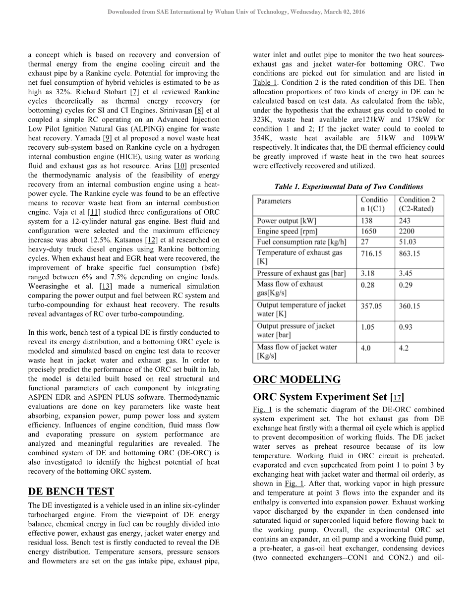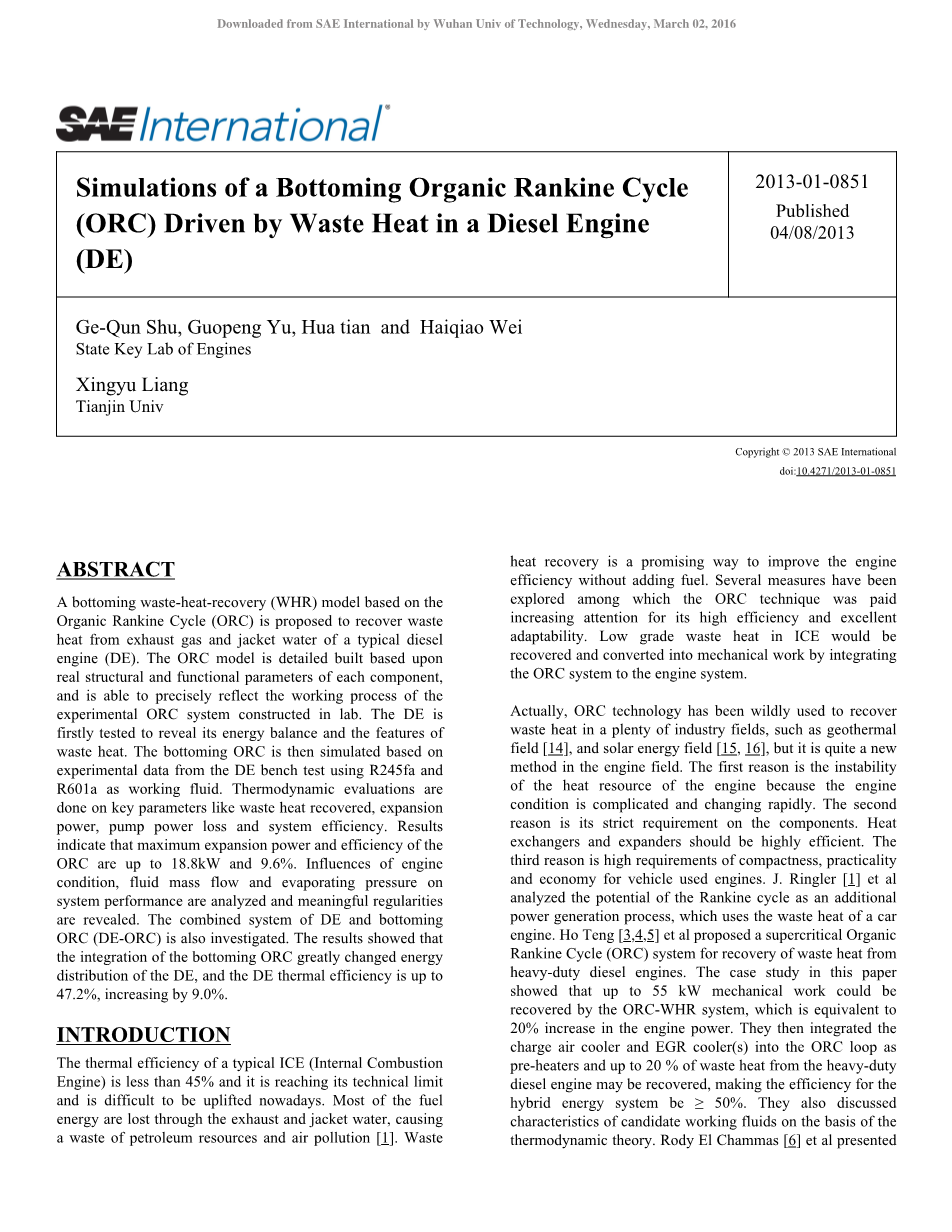 其实,在许多工业领域,已经广泛采用ORC技术来回收余热,如地热领域和太阳能领域,但在发动机领域,这还是一个比较新颖的技术。一是发动机热资源的不稳定性,因为发动机的工况是复杂和迅速变化的。二是ORC系统在组成部分要求比较严格,换热器和膨胀机的效率要求较高。三是对车用发动机紧凑性、实用性以及经济性的要求很高。J.格勒等人分析了朗肯循环在利用汽车的发动机余热作为一个额外的发电过程中的潜力。昊腾等人针对重型柴油机的余热回收提出了一种超临界有机朗肯循环(ORC)系统,本文的案例研究表明,ORC-WHR系统可以恢复高达55KW的机械功,这相当于将发动机功率提高了20%,然后它们集成增压空气冷却器和(多个)EGR冷却器到有机朗肯循环回路作为预加热器,并且最多可以回收重型柴油发动机的余热的20%,使得对于混合能量系统的效率ge;50%;他们还在热力学理论的基础上讨论了候选工质的特性。Rody El Chammas等人提出了一种基于从发动机冷却回路和朗肯循环的排气管回收和转换热能的理念,能够潜在地改善混合动力汽车的燃油消耗量预计高达32%。Richard Stobart等人回顾了朗肯循环理论作为热能回收循环在汽油和柴油发动机上的应用。Srinivasan等人在一种先进的注射低引燃天然气发动机(阿尔派)上进行一个简单的钢筋混凝土操作来进行余热的回收。Yamada等人基于朗肯循环在氢内燃机上提出了一种以水作为工质和废气作为热源的新型余热回收系统。Arias提出了采用动力循环内燃机回收能量可行性的热力学分析,表明朗肯循环是回收内燃机余热的有效手段。Vaja等人为12缸天然气发动机研究了三种配置的ORC系统,选择最佳的流体和结构,最大效率提高了约12.5%。Katsanos等人研究了重型卡车柴油发动机使用朗肯循环的情况,当对废气热能和EGR的热量进行回收时,根据发动机负荷,改进的制动燃油消耗率(BSFC)介于6%和7.5%。Weerasinghe等利用数值模拟对比了ORC系统和涡轮复合在利用余热方面的输出功率和耗油量,结果揭示了ORC系统较涡轮复合更有优势。