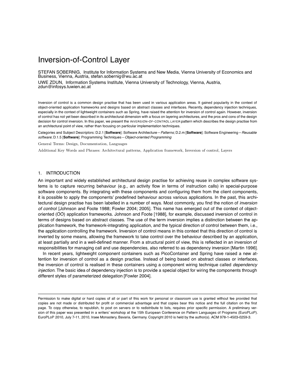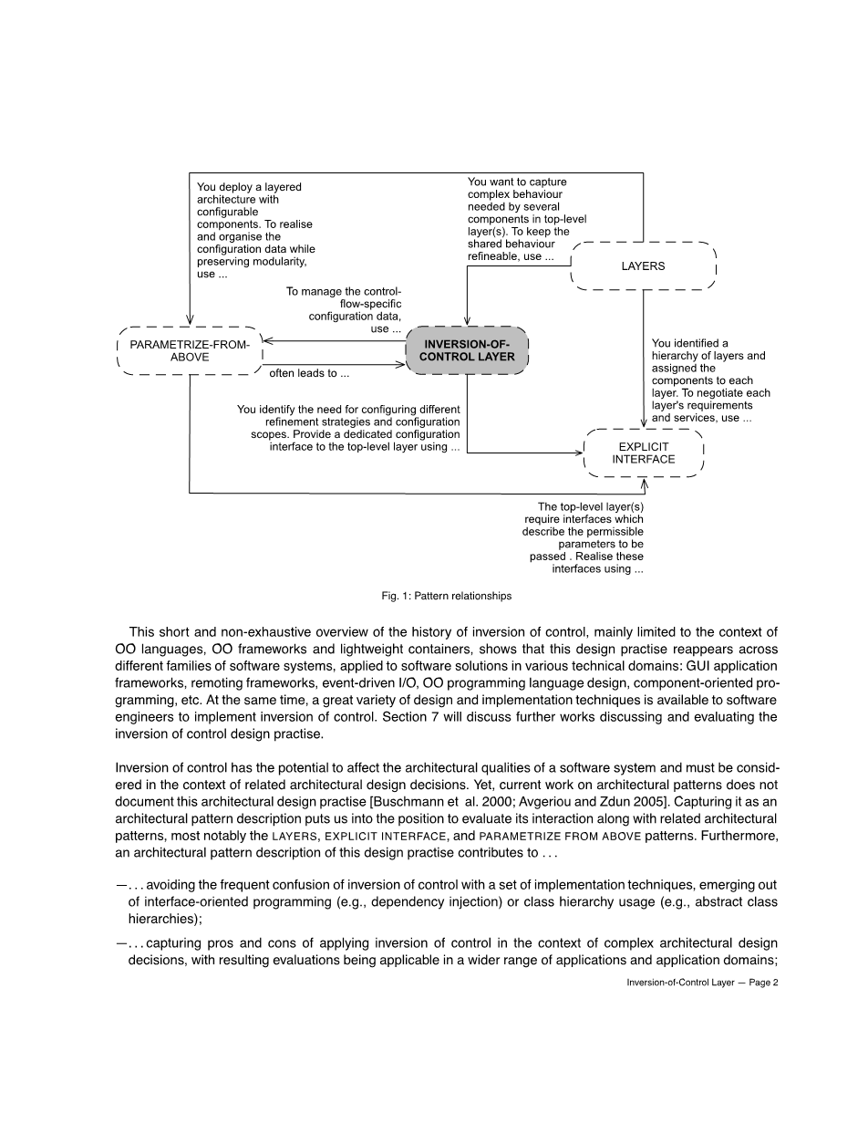 控制的反转有可能影响软件系统的架构质量,必须在相关架构设计决策的背景下考虑。然而,目前关于建筑模式的工作并没有记录这种建筑设计实践。捕获它作为一种建筑模式描述使我们能够评估其相互作用以及相关的建筑模式,最显着的是“层”,“显示界面”和“从上方的参数”模式。
