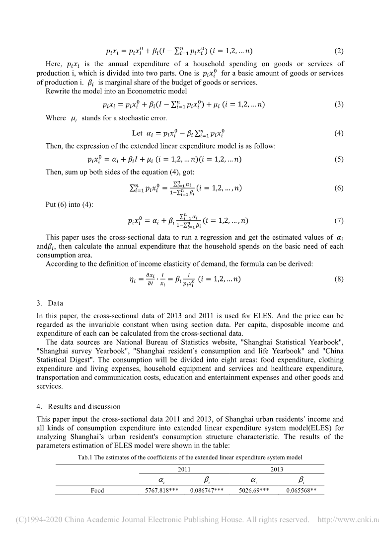 居民的消费结构在各种力量的影响下悄然发生了变化。上海作为我国经济发展水平最高的沿海城市之一,在国民经济各项指标和经济发展中一直处于领先地位。因此,其发展过程具有一定的实验性,对我国许多城市的发展具有借鉴意义。因此,本文采用扩展线性支出系统模型( ELES )对上海城镇居民消费的基本结构和特征进行分析。