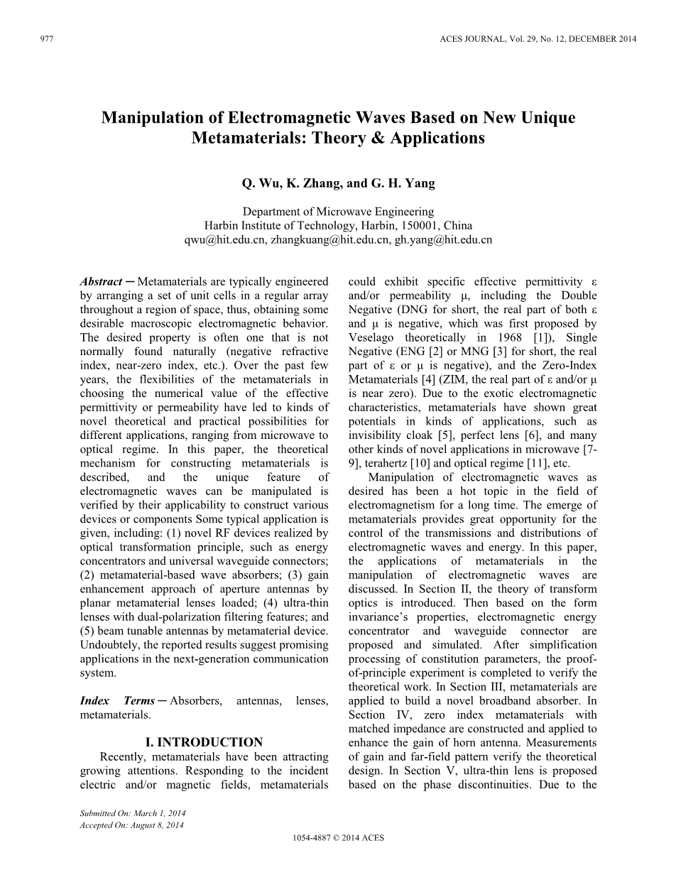 摘要——超材料通常是通过在整个空间区域内以常规阵列的形式排列一组单元格来设计的,从而在整个空间区域内获得一些理想的宏观电磁性能。理想的属性通常不是自然存在的(负折射率、近零折射率等)。在过去的几年里,超材料在选择有效介电常数或磁导率数值时的灵活性,为从微波到光学领域的不同应用带来了各种新的理论和实践可能性。在本文中,描述了构造超材料的理论机制,通过电磁波在构建各种器件或元件中的适用性,验证了电磁波的可操控性,并给出了一些典型的应用,包括:(1)利用光学变换原理实现的新型射频器件,如能量集中器和通用波导连接器; (2)超材料吸波器; (3)加载平面超材料透镜的孔径天线增益增强方法; (4)具有双偏振滤波功能的超薄透镜;和(5)利用超材料装置实现波束可调天线。毫无疑问,报告的结果表明在下一代通信系统中有很好的应用前景。