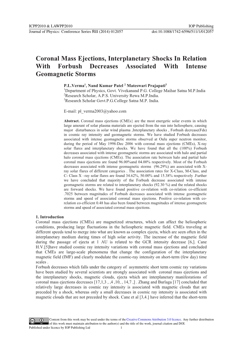 CMEs是磁化的结构,能影响日球层环境条件并使日球层磁场发生巨大的波动。以不同速度传播的CMEs倾向于合并为所谓的复杂抛射体,在太阳高年尤为常见于行星际介质。GCR强度下降与抛射物通过1AU时出现的磁场的增强有关。[6]. Cane H.V.[5] 研究了基于CME的宇宙线强度变化,结论得出CMEs是大规模的现象,能改变行星际磁场(IMF)的结构并明显调制宇宙线强度的短期(几天)变化。