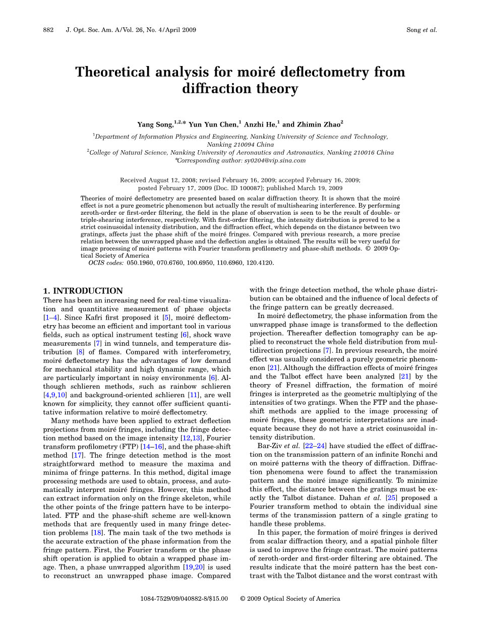我们基于标量衍射理论提出了莫尔偏转测量理论。结果表明,莫尔效应不是纯粹的几何现象,而是实际上是多重干涉的结果。通过零级或一级滤波,观察平面中的场被认为分别是二重或三重干涉的结果。通过一级滤波,强度分布被证明是一个严格的余弦强度分布,衍射效应取决于两个光栅之间的距离,只影响莫尔条纹的相移。与以前的研究相比,我们得到了展开相位和偏转角度之间的更精确的关系。这些结果将对采用傅立叶变换轮廓术和相移方法的莫尔图案图像处理非常有用。 copy;2009美国光学学会