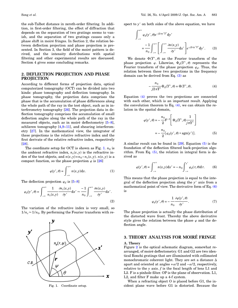 根据投影数据的不同形式,光学计算机断层扫描(OCT)可分为两种:相位断层扫描和偏转断层扫描。在相位层析成像中,投影数据包括相位,即沿着测试对象中射线的整个路径的相位差的累积,例如在干涉层析成像[26]中。偏转层析成像中的投影数据包括在被测物体中沿着整个光线路径的小偏转角积累,如莫尔偏转测量[5-8],纹影层析成像 [4, 9-11] 和剪切干涉测量[27]。 在数学观点中,这些投影的积分器分别是相对折射率和相对折射率的一阶导数[28]。