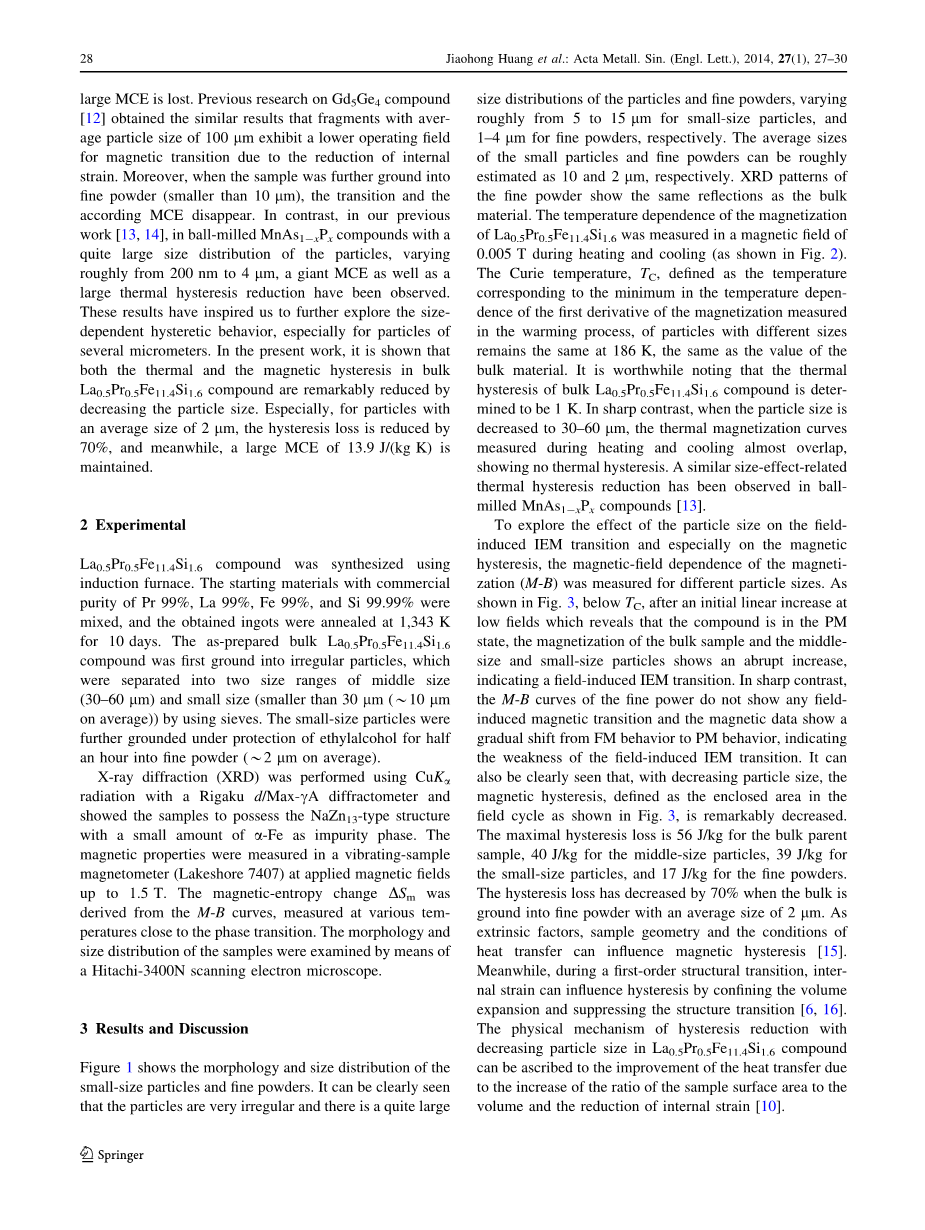 L0.5 Pr0.5Fe11.4Si1.6化合物的粒径大小对其磁热滞性能以及磁热效应的影响外文翻译资料