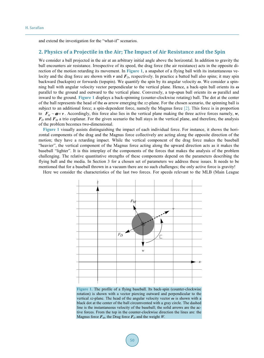 图1能够直观地向我们展示各个作用力对于棒球的影响。例如,它显示了阻力的水平分量和马格努斯力共同作用于运动的相反方向,对球的运动起到阻碍作用。当阻力的垂直分量使棒球“更重”时,沿着向上方向作用的马格努斯力的垂直分量使棒球“更轻”。正是因为这些力相互作用,相互影响,使得这个问题的分析变得具有挑战性。而这些力的各个组成部分的相对定量强度取决于描述飞球和介质的参数。我们将在在第3节中解决这些问题。需要注意的是,若棒球运动在真空当中,则这个问题将大大简化,我们唯一需要考虑的力便是重力!