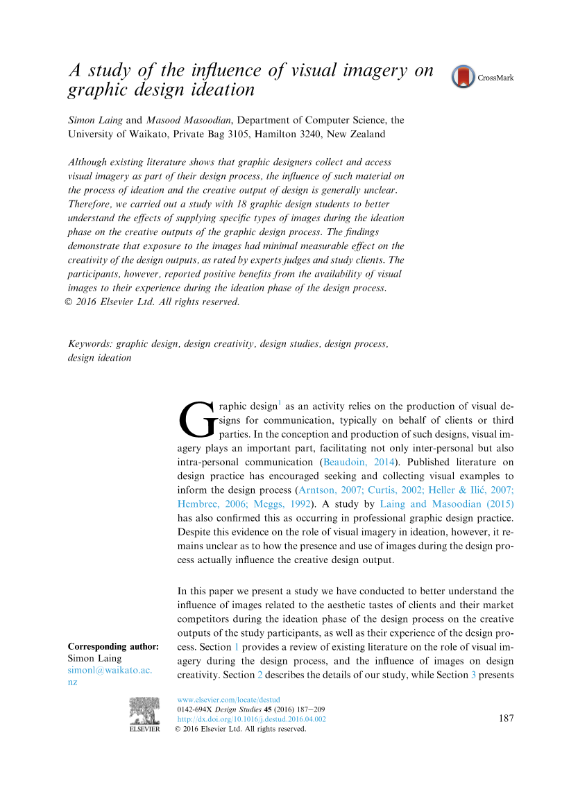 平面设计是依赖于视觉设计沟通的结果的设计,通常代表客户或第三方。在设想和设计的结果中,视觉图像扮演了一个重要的部分,不仅促进了人际间的交流,而且促进了个人内心与设计师的交流 (Beaudoin, 2014)。发表的关于设计实践的文献鼓励寻求和收集视觉实例来报告设计过程(Arntson,2007; Curtis,2002; Heller amp;Ilic`,2017; Hembree,2006; Meggs,1992)。 Laing和Masoodian(2015)的研究也证实了这一点,在专业平面设计实践中发生。然而,尽管有关视觉图像在观念中的作用的证据,但仍然不清楚在设计中图像的存在和使用 过程实际影响创意设计输出。