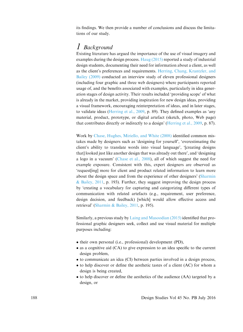 现有文献对于在设计过程中使用视觉图像和示例的重要性有不同意见。 Haug(2015)报道了一项关于工业设计学生的研究,记录了他们对客户信息的需求,包括客户的偏好和要求。Herring, Chang, Krantzler, and Bailey (2009)对11位专业设计师进行了面试 (包括四位图形和三位网页设计师)参与者报告使用和与示例相关的好处,特别是在设计活动的想法阶段。他们的结果包括“提供范围” 已经在市场上,为新的设计理念提供灵感,一个视觉框架,鼓励思想的重新诠释,并在后期阶段, 验证想法(Herring等人,2009年,第89页)。他们将例子定义为“任何” 材料,产品,原型或数字人工制品(草图,照片,网页) 这直接或间接地促成了设计“(Herring等人,2009年,第87页)。