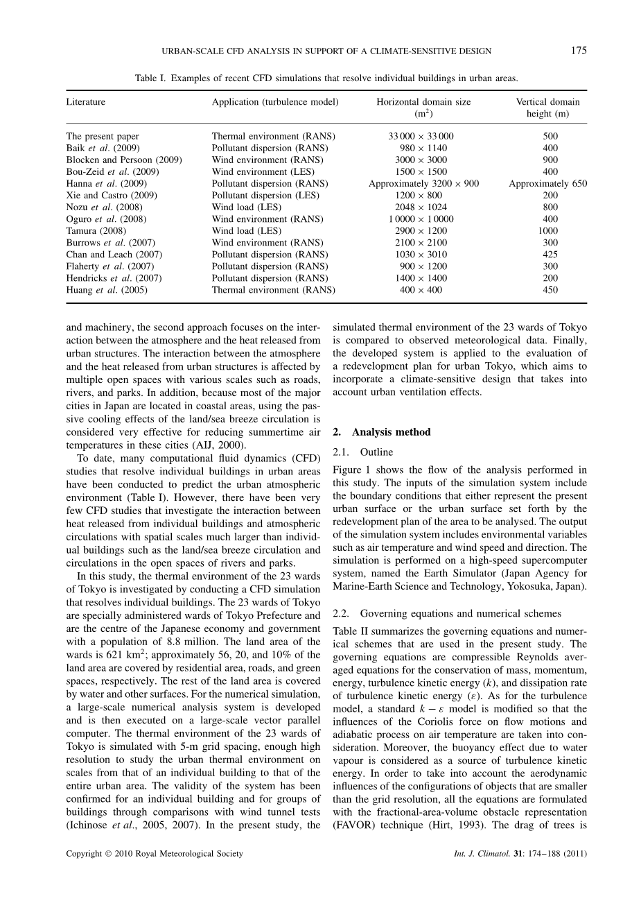 在这项研究中,东京23区的热环境是通过进行CFD模拟来解决单个建筑物的。东京的23个病房是东京都的特别管理区,是日本经济和政府的中心,人口为880万人。病房面积621平方公里;大约56,20和10%的土地面积分别被住宅小区,道路和绿地覆盖。其余的土地覆盖着水和其他表面。对于数值模拟,开发了大规模数值分析系统,然后在大规模矢量并行计算机上执行。东京23区的热环境模拟了5米网格间距,足够高的分辨率,研究了从个体建筑到整个城市的城市热环境。通过与风洞试验进行比较,已经确定了一个单独建筑物和一组建筑物的系统的有效性(Ichinose等人,2005年,2007年)。在本研究中,将东京23区的模拟热环境与观测到的气象数据进行比较。最后,将开发的系统应用于城市东京重建计划的评估,其目的是将考虑到城市通风效应的气候敏感设计纳入考虑。