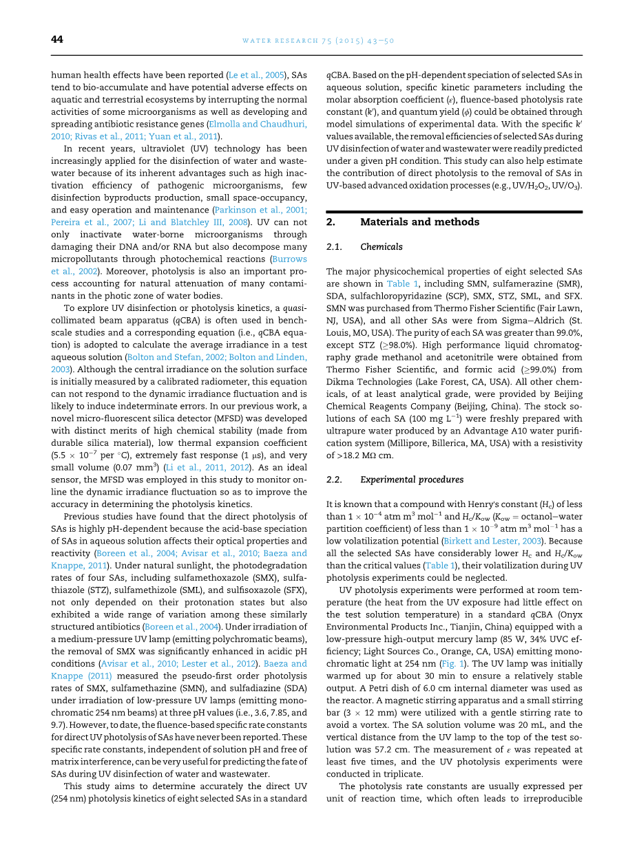 先前的研究已经发现,由于SAS在水溶液中的酸碱形态影响其光学性质和反SAS的直接光解高度依赖于pH值。(Boreen et al., 2004; Avisar et al., 2010; Baeza and Knappe, 2011).阳光下,SAs存在四种光降解率,包括磺胺甲恶唑(SMX)、磺胺噻唑(STZ),磺胺(SML),磺胺异恶唑(SFX),在这些同样结构的抗生素不仅取决于其质子化状态也表现出广泛的变化。(Boreen et al., 2004). 中等压力的紫外灯照射下(发光多色光束),SMX除去在酸性pH条件下显著提高(Avisar et al., 2010; Lester et al., 2012). 巴埃萨,克纳佩(2011)测准一级的光解速率SMX,磺胺二甲嘧啶(SMN),与磺胺嘧啶(SDA)低压紫外灯照射下(发光的单色254nmbeams)在pH值为三(即3.6,7.85,9.7)。然而,到目前为止,基于特定的速率常数的影响SAS直接光解未见报道。这些特定的速率常数,独立的溶液的pH值,可用于水和废水紫外线消毒在SAS的命运预测是非常有用的。
