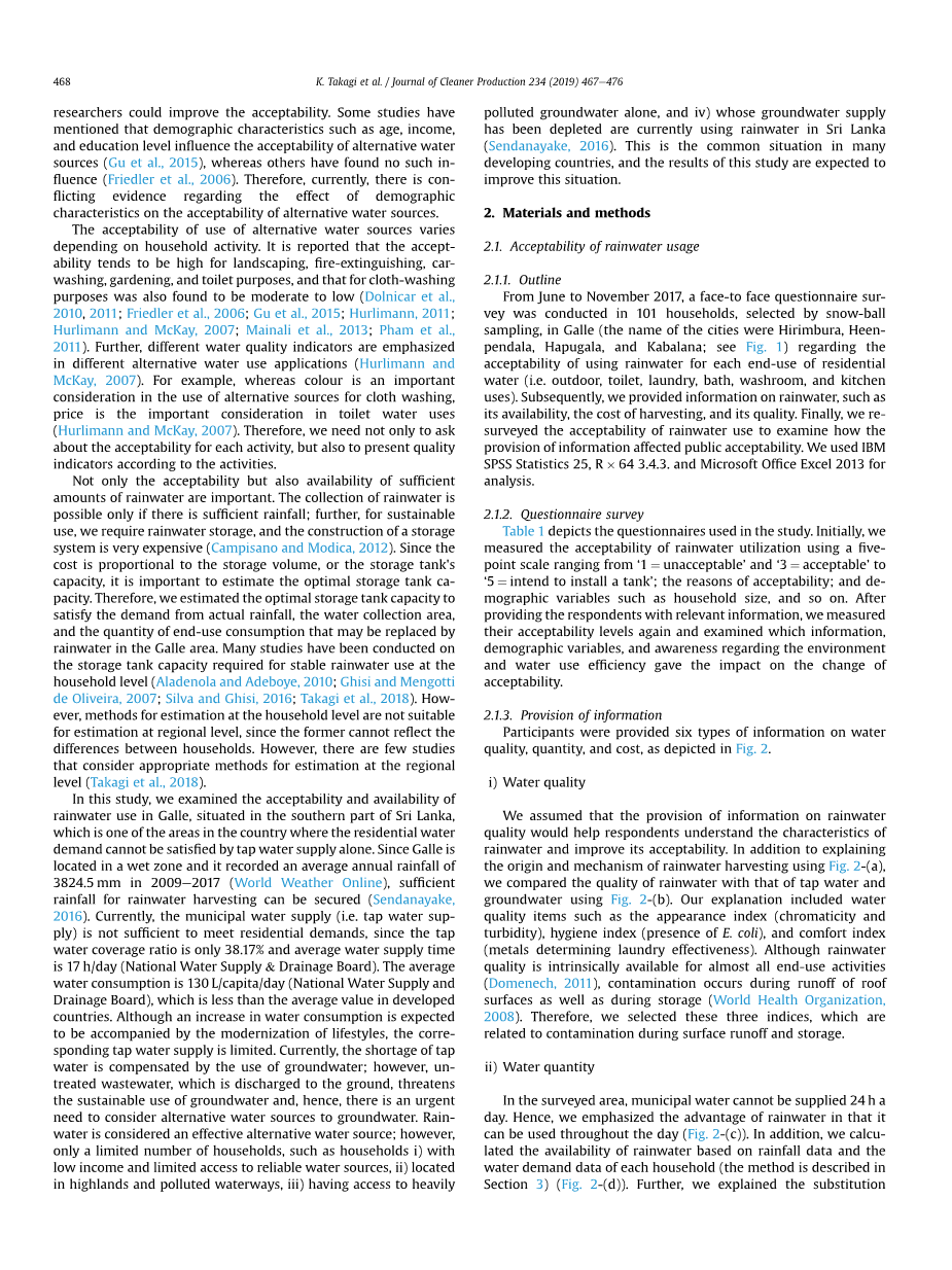 2017年6月至11月,以“雪球”为对象,对101户家庭进行了面对面问卷调查在加勒采样(城市的名字是希里姆布拉、希恩潘达拉、哈普加拉和卡巴拉纳;见图1)可接受的使用雨水为每个最终用途的住宅水(即室外、厕所、洗衣房、浴室、洗手间和厨房)使用)。随后,我们提供了关于雨水的信息,例如它的可用性,收获的成本和质量。最后,我们对雨水利用的可接受性进行了重新调查信息的提供影响了公众的接受度。我们使用IBMSPSS统计软件25,rtimes;64 3.4.3和Microsoft Office Excel 2013 来分析。