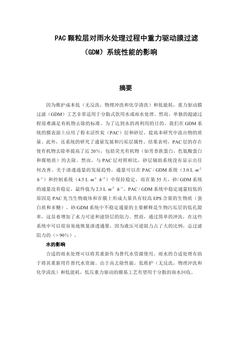 PAC颗粒层对雨水处理过程中重力驱动膜过滤(GDM)系统性能的影响外文翻译资料 2023-09-06 10:58:33 英语原文共 10 页,剩余内容已隐藏,支付完成后下载完整资料 英语译文共 19 页,剩余内容已隐藏,支付完成后下载完整资料 资料编号:[608679],资料为PDF文档或Word文档,PDF文档可免费转换为Word 您需要先支付 30元 才能查看全部内容!立即支付 发小红书推广免费获取该资料资格。点击链接进入获取推广文案即可: Ai一键组稿 | 降AI率 | 降重复率 | 论文一键排版 PREVIOUS NEXT 您可能感兴趣的文章 印染厂废水处理工艺设计开题报告 改性生物炭对四环素的吸附开题报告 湖北省襄阳市谷城县城关镇南部排水工程设计开题报告 洋坪镇城区给水工程设计开题报告 西宁电力大厦建筑给排水设计开题报告 四川省广安市鼎屏镇排水工程设计文献综述 林州市城区排水管网及污水处理系统设计文献综述 越秀星空大楼给排水工程设计文献综述 湖北省黄石某镇排水工程设计开题报告 德国卢萨蒂亚酸性开采湖泊沉积物中磷的迁移率外文翻译资料