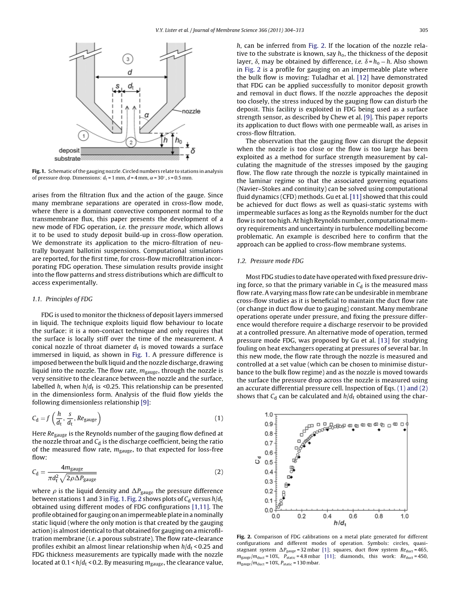 哪里是液体密度和图1中站1和3之间的压力差。图2显示了使用不同模式的FDG配置[1,11]获得的Cd 与h / dt 的关系曲线。在标称静态液体中的不可渗透的板上获得的轮廓(其中唯一的运动是由测量作用产生的)几乎与在微滤膜(即多孔基底)上获得的那些相同。当h / dt lt;0.25时,流速 - 间隙曲线呈现几乎线性的关系,并且FDG厚度测量通常在喷嘴位于0.1 lt;h / dtlt;0.2时进行。通过测量m规 ,间隙值h可以从图2中推断出来。如果喷嘴相对于基板的位置是已知的,比如说,沉积层的厚度,ı,可以通过差异,即=hominus;h.图2中还示出了用于在不透水板上测量的曲线,其中整体流动是移动的:Tuladhar等人。[12]已经证明FDG可以成功应用于监测管道流中的沉积物生长和去除。如果喷嘴接近沉积物,则由测量流引起的应力会干扰沉积物。如Chew等人所述,该设施在FDG中被用作表面强度传感器。[9]。本文报道了其在一个可渗透壁上的管道流动的应用,如交叉流过滤中出现的那样。