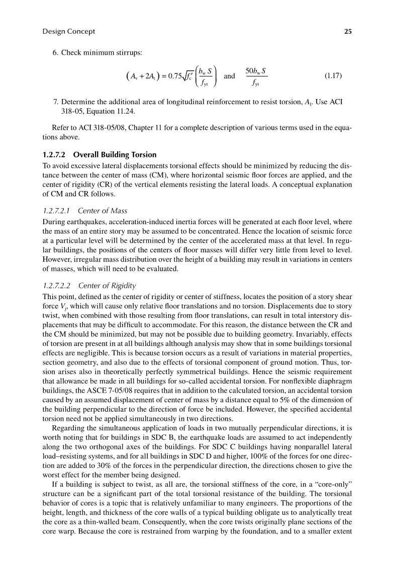 Tb avoid excessive lateral displacements torsional effects should be minimized by reducing the distance between the center of mass (CM), where horizontal seismic floor forces are applied, and the center of rigidity (CR) of the vertical elements resisting the lateral loads. A conceptual explanation of CM and CR follows.