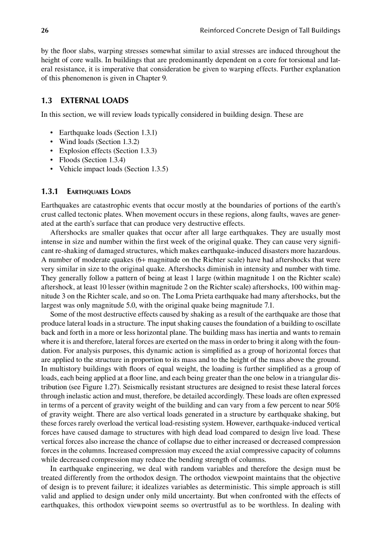 地震导致的震动所造成的一些最具破坏力的影响是那些在结构中产生侧向荷载的影响。输入的震动会导致建筑物的基础在或多或少的水平面内来回摆动。建筑质量具有惯性,并且希望保留在原处,因此,侧向力会施加在质量上,以使其与基础结合在一起。出于分析目的,此动态作用简化为一组水平力,该水平力与结构的质量和质量在地面上方的高度成比例地施加到结构上。在楼层均等的多层建筑物中,将载荷简化为一组载荷,每个载荷施加在一条地板线上,并且在三角形分布中均大于下面的载荷(请参见图1.27)。抗震结构设计成通过非弹性作用来抵抗这些侧向力,因此必须进行相应的详细说明。这些负载通常以建筑物重力重量的百分比表示,并且可以从重力重量的百分之几到接近50%不等。地震震动还会在结构中产生垂直载荷,但是这些力很少会使垂直载荷抵抗系统过载。但是,与设计活荷载相比,地震引起的垂直力已经对具有高静载的结构造成了损坏。这些垂直力还会由于柱中压缩力的增加或减少而导致倒塌的机会。增加的压缩量可能会超出柱的轴向压缩能力,而减少的压缩量可能会降低柱的抗弯强度。