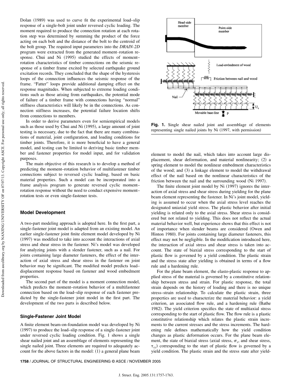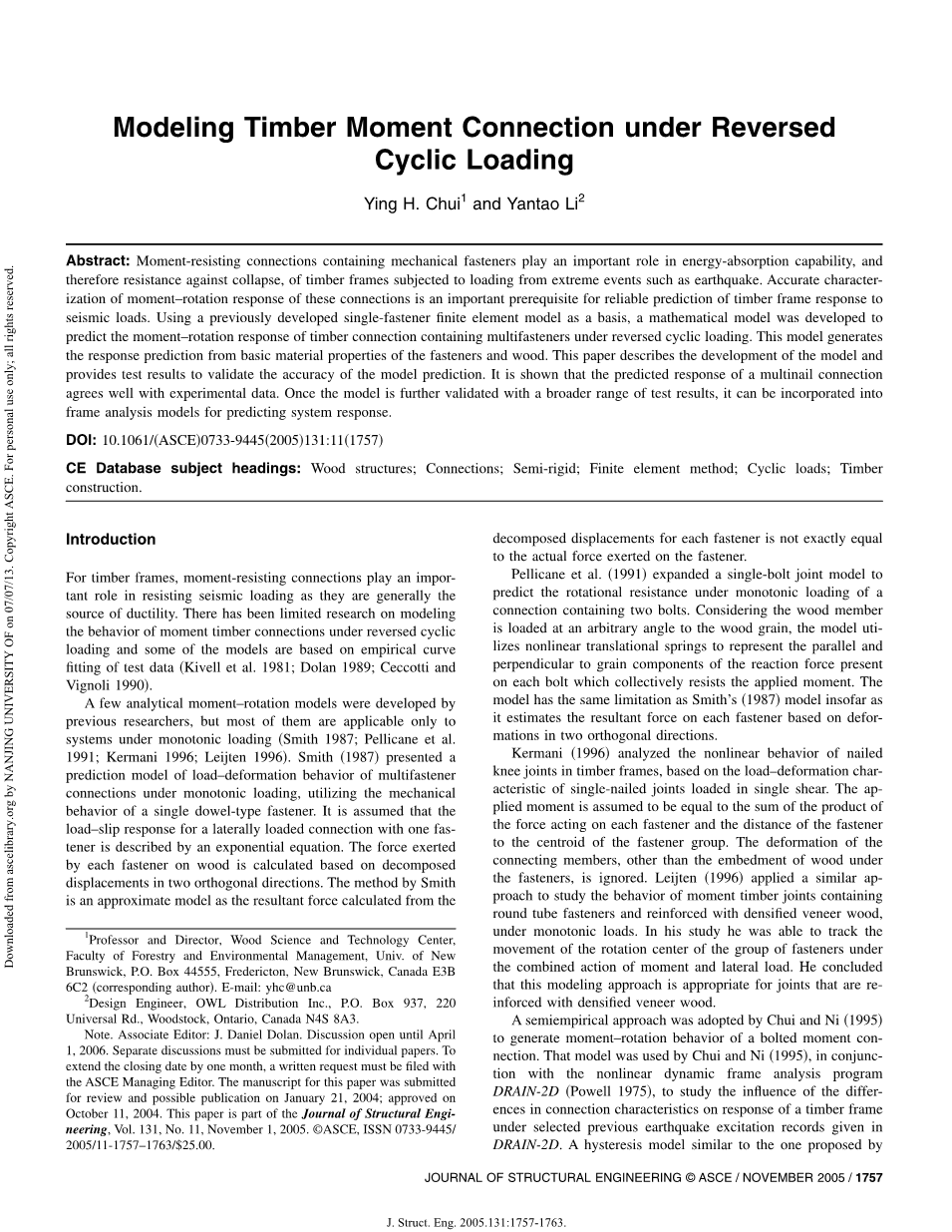 A semiempirical approach was adopted by Chui and Ni 1995 to generate moment–rotation behavior of a bolted moment connection. That model was used by Chui and Ni 1995, in conjunction with the nonlinear dynamic frame analysis program DRAIN-2D Powell 1975, to study the influence of the differences in connection characteristics on response of a timber frame under selected previous earthquake excitation records given in DRAIN-2D. A hysteresis model similar to the one proposed by Dolan 1989 was used to curve fit the experimental load–slip response of a single-bolt joint under reversed cyclic loading. The moment required to produce th