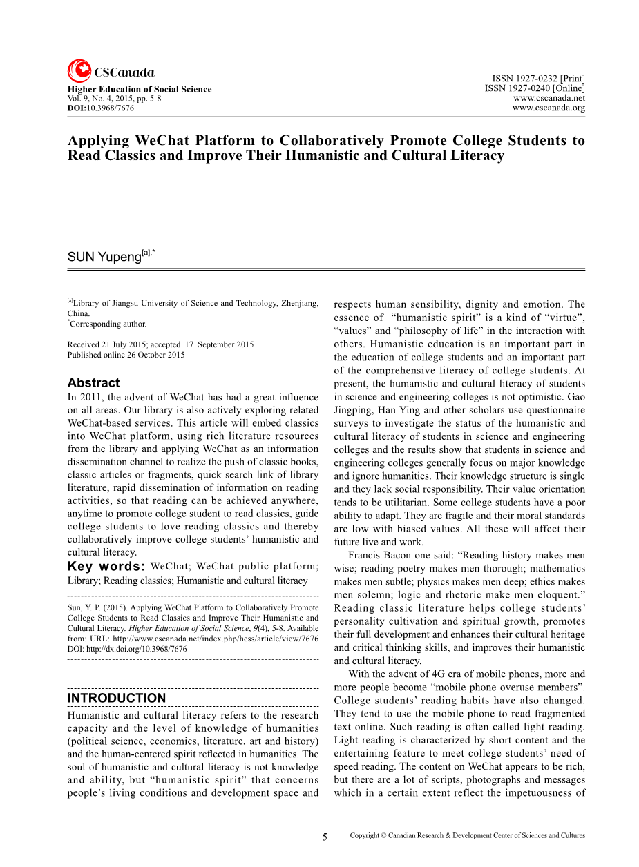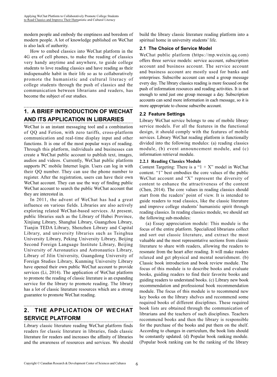 关键词:微信;微信公众平台;图书馆;阅读经典;人文和文化素养