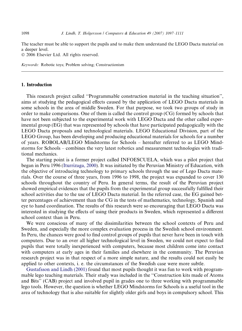 这个起点是一个名为INFOESCUELA的前项目,这是1996年在秘鲁开始的一个试点项目(Iturrizaga, 2000)。它是由秘鲁教育部发起的,目的是通过使用LEGO Dacta材料向小学介绍技术。在1996年至1998年的三年期间,该项目扩大到秘鲁全国130所学校。总的来说,秘鲁项目的结果显示,来自实验组的学生因为使用了LEGO Dacta材料成功地完成了他们的学校活动。在参考案例中,EG组在数学、技术、西班牙语和眼手协调测试中的成绩比CG组要好。这项代表秘鲁的一个不同的学校环境的研究结果是如此令人鼓舞,以至于LEGO Dacta对于在瑞典研究使用他们的产品的影响十分有兴趣。