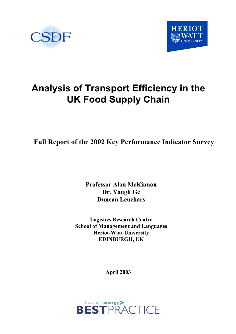 在1998年10月的两天内,约有2300辆载有食品的运输车辆其运输活动受到了密切的监控,得出了这些运输车辆的运输效率,其运输效率是根据一组标准的关键绩效指标来衡量的。据了解,这是世界上首次大规模地对运输工具的运输效率进行的调查。此次调查允许这些参与公司对其运输效率进行基准测试,并且提出了在运输成本、能源消耗和排放中存在的潜在减少总估计。在一项后续进行的调查中,这些公司表示此次运输活动为其带来了实际的利益,而且还表达了他们继续参加未来调查的欲望。此次研究的完整报告发表于1999年11月,这份报告基于英国政府提出的可持续配送战略的背景下提出了使用运输效率关键绩效指标的倡议,并且回顾之前在物流运输效率基准测试方面的研究。