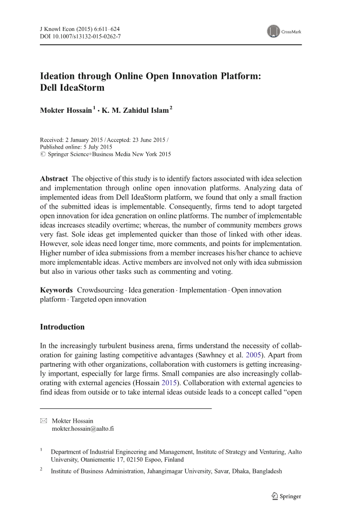 研究指出外部贡献者的贡献对创新很重要(Chesbrough,2003; West和Lakhani2008)。 客户是新思想和创新的重要来源(Di Gangi和Wasko2009)。 最近对美国和欧洲的大公司进行的一项调查显示,大公司非常重视让客户参与创意生产(Chesbrough和Brunswicker2013)。 企业组织在线平台与客户,供应商,员工,合作伙伴,公民和监管机构进行生态系统开发(Gouillart和Billings2013)。 客户尤其是维持任何业务的关键利益相关者,因此,他们的参与对任何组织都至关重要。