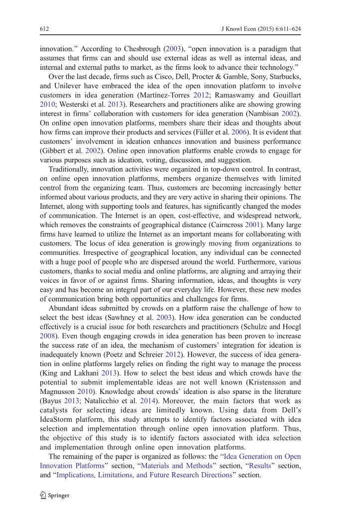 群众在平台上提交的丰富想法提出了如何选择最佳想法的挑战(Sawhney et al。2003)。 如何有效开展创意对于研究人员和从业人员来说都是至关重要的问题(Schulze和Hoegl2008)。 虽然引人入胜的创意产品已被证明可以提高创意的成功率,但客户对创意的整合机制却鲜为人知(Poetz和Schreier2012)。 然而,在线平台的创意成功在很大程度上依赖于找到正确的方式来管理流程(King和Lakhani2013)。 如何选择最佳想法以及哪些人群有可能提交可实施的想法尚不为人所知(Kristensson和Magnusson2010)。 有关群众意识的知识在文献中也很稀少(Bayus2013; Natalicchio等人2014)。 而且,作为选择思路的催化剂的主要因素是有限的。 本研究利用戴尔IdeaStorm平台的数据,试图通过在线开放式创新平台确定与思想选择和实施相关的因素。 因此,本研究的目标是通过在线开放式创新平台确定与思想选择和实施相关的因素。