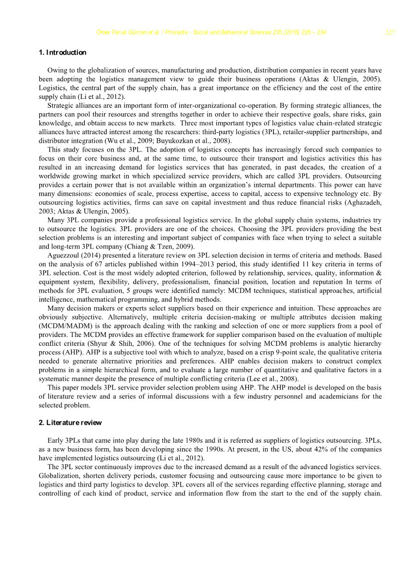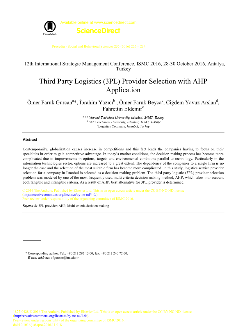 基于层次分析法(AHP)的第三方物流(3PL)供应商选择Ouml;merFarukGuuml;rcana*,İbrahimYazıcıb,Ouml;merFaruk Beycac,Ccedil;iğdemYavuz Arsland,