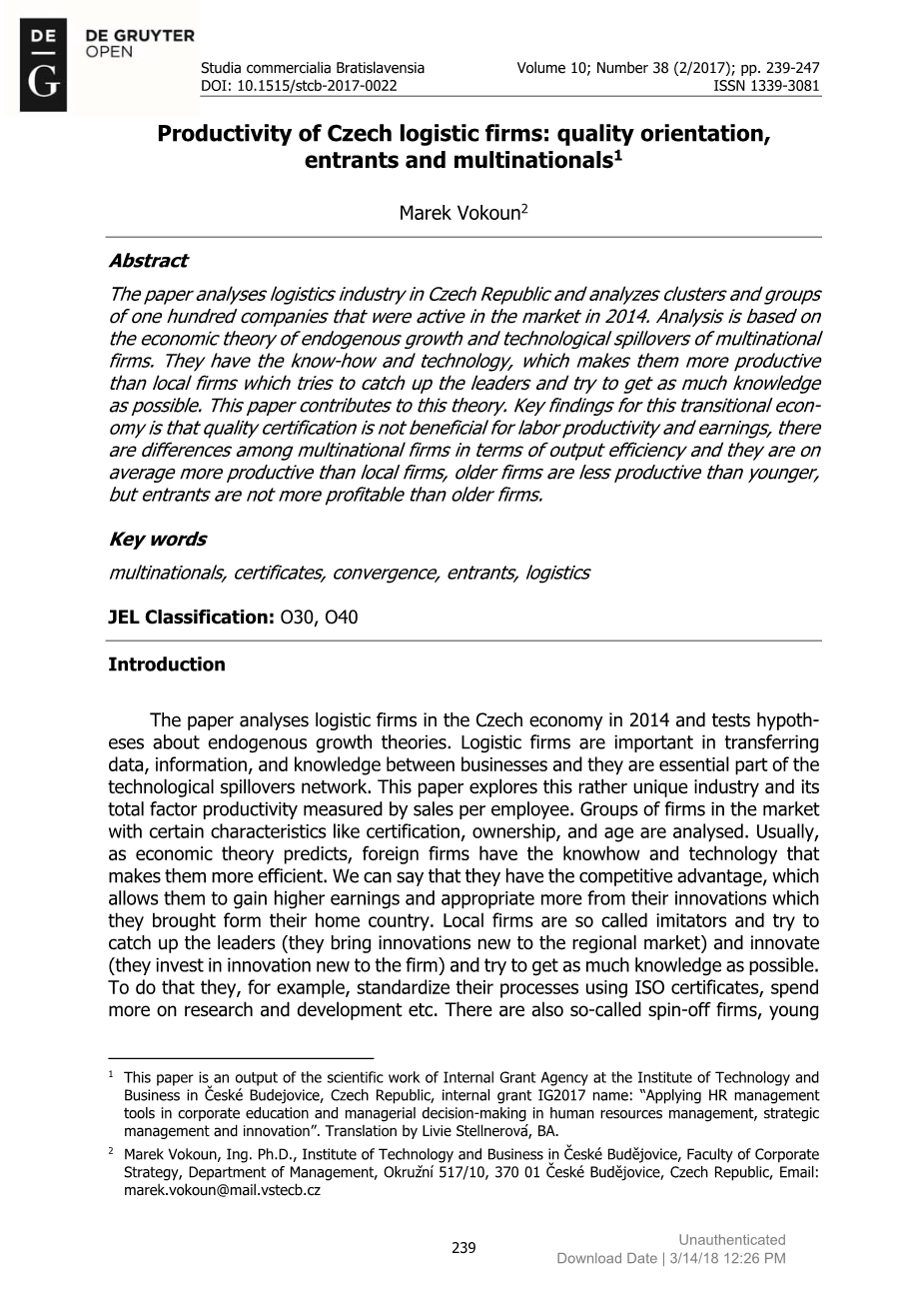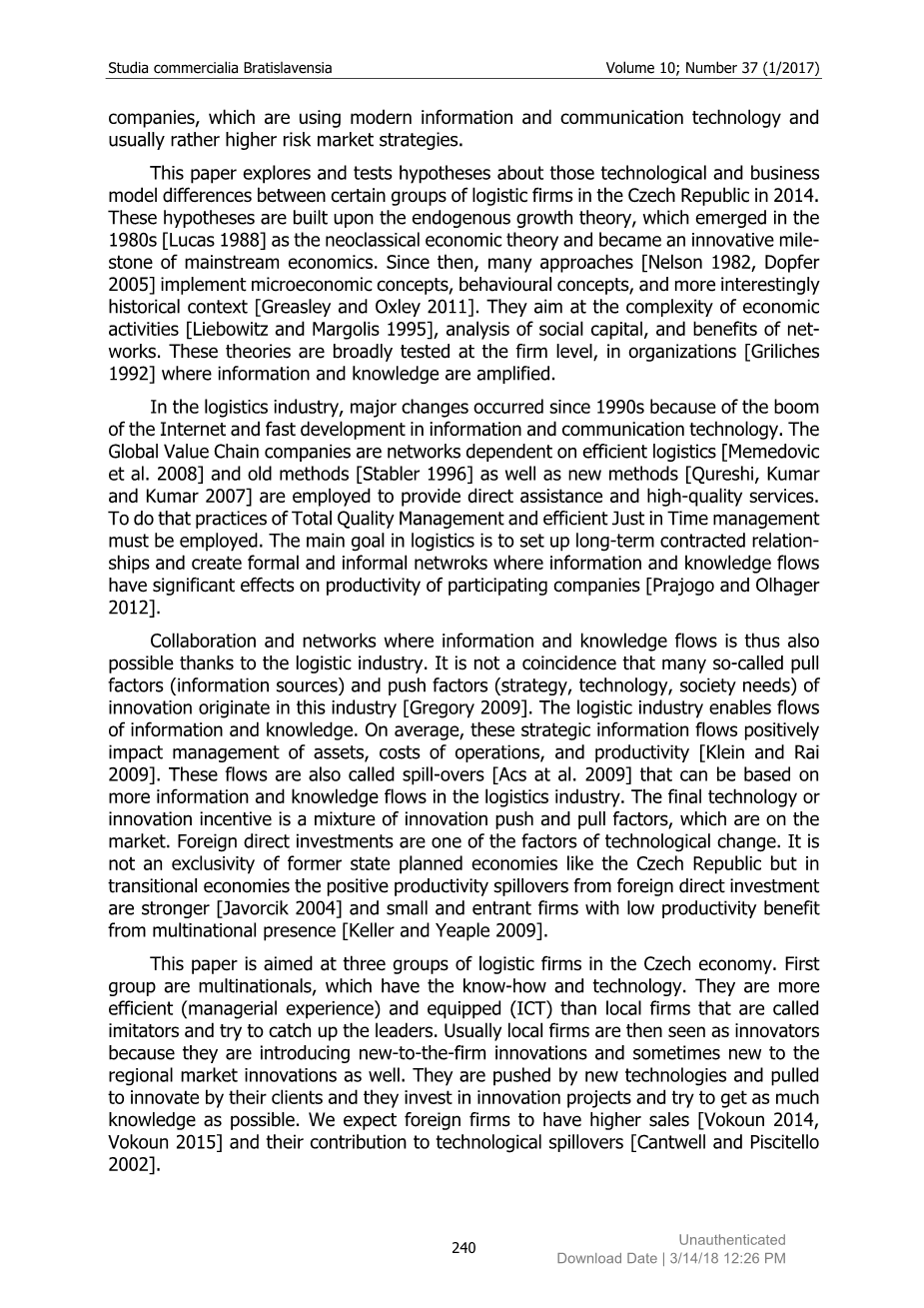 本文分析了2014年捷克经济中的物流企业并测试了关于内生增长理论的假设。物流企业在企业间传递数据,信息和知识方面很重要,它们是技术溢出网络的重要组成部分。本文探讨了这个相当独特的行业及其按人均销售额衡量的全要素生产率,分析市场上具有某些特征(如认证 ,所有权和年龄)的企业集团。正如经济理论预测的那样,通常情况下,外国公司拥有使他们更高效的专有技术。 我们可以说他们具有竞争优势,这使他们能够获得更高的收入,并从他们带来的创新中获得更多收益。 本地公司被称为模仿者,试图赶上领导者(他们为区域市场带来新的创新)和创新(他们投资于公司的新创新),并尽可能地获得尽可能多的知识。 为此,他们使用例如ISO证书来标准化他们的流程,在研发等方面花费更多。还有所谓的分拆公司,年轻的公司正在使用现代信息和通信技术,并且通常采用更高风险的市场策略。