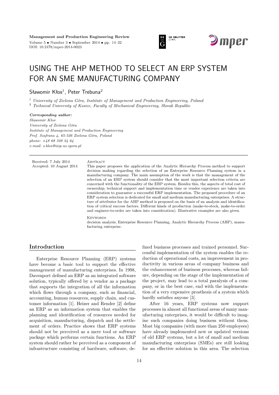 摘要:本文提出了应用层次分析法来支持制造企业选择企业资源规划系统的决策。 这项工作的主要假设是选择ERP系统的管理应该考虑到最重要的选择标准与ERP系统的功能有关。 除此之外,还考虑了总体拥有成本,技术支持和实施时间或供应商经验等方面的问题,以确保成功实施ERP。 建议的ERP系统选择程序专门针对中小型制造企业。在分析和确定关键成功因素的基础上,提出了AHP方法的属性结构。 不同类型的生产(按库存,按订单生产和按订单生产)被考虑在内。 还给出说明性的例子。