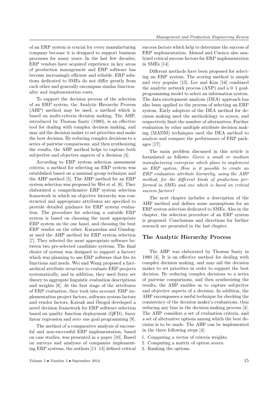 为了支持选择ERP系统的决策过程,可以使用层次分析法(AHP),这是一种基于多准则决策的方法。 Thomas Saaty(1980)提出的层次分析法是处理复杂决策的有效工具,可以帮助决策者确定优先事项并做出最佳决策。通过将复杂决策减少到一系列成对比较,然后综合结果,AHP方法有助于捕捉决策的主观和客观两个方面[4]。