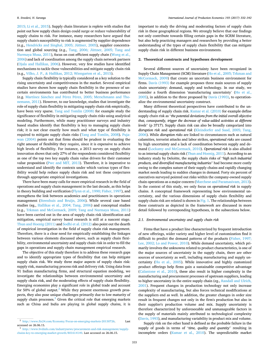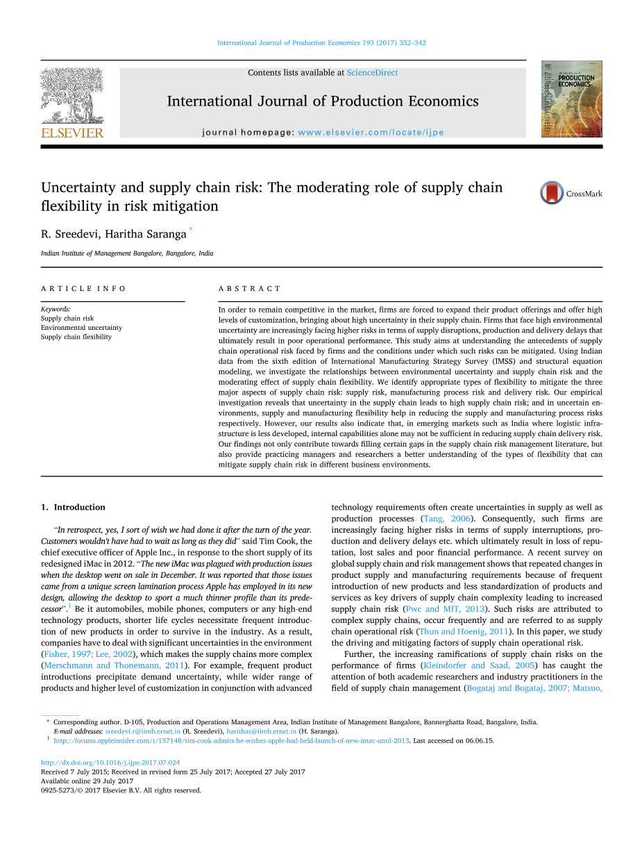因此,本研究的目标是解决这些研究差距,并确定适当类型的有助于缓解供应链风险的灵活性。我们研究供应链风险的三个主要方面:供应风险,制造过程风险和交付风险。利用印度91家制造企业的数据和结构方程模型,研究环境不确定性与供应链风险之间的关系,以及供应链柔性的调节效应。 新兴经济体在全球贸易中占有重要地位,占全球产量的50%。虽然它们呈现出巨大的增长前景,但也由于供应链流程成熟度低而带来了独特的挑战。鉴于中国和印度等新兴市场在全球供应链中所扮演的关键角色,研究这些地区供应链风险的驱动因素和调节因素是重要的。 我们坚信,我们的研究结果不仅有助于填补SCRM文献中的某些空白,还能帮助实践经理和研究人员更好地理解供应链灵活性的类型,从而可以缓解不同商业环境下的供应链风险。