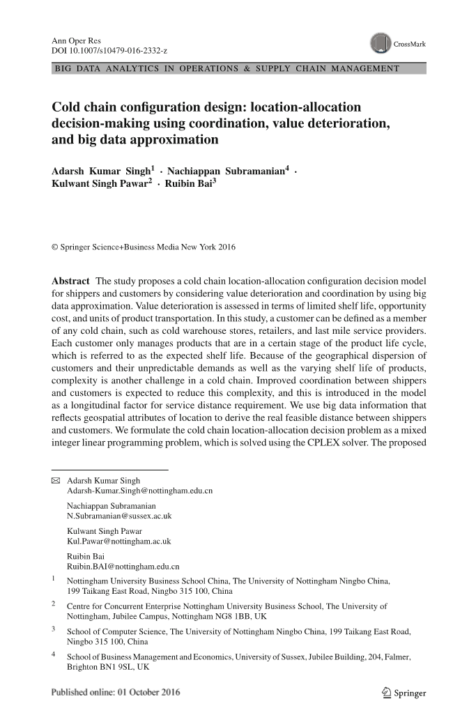 本研究通过整合决策中考虑易腐性因素而有助于位置分配的文献,已经解决耐用产品的位置分配研究并且已经使用客户服务要求建模。在本项研究中,客户可以被定义为任何冷链成员,如冷链仓库,零售商和最后一英里服务提供商。每个客户仅管理处于产品生命周期某个阶段的产品,这被称为预期的保质期(ESL)。此外,同一产品可能由于订单频率,邻近使用点(PoU)和销售市场而具有不同的ESL和不同的产品价值,并且各种客户可能需要相同的产品。具有不同ESL的地理分散的客户增加了满足需求所需的协调的复杂性。通过选择和分配满足客户的ESL的存储位置来实现协调。这通过将ESL转换为服务距离要求而并入模型中。所提出的模型允许产品的离散和连续运输单元。例如,分段产品以离散单位流动,而重量(以千克计)以连续单位流动。易腐产品的价值随着时间而恶化(Coelho和Laporte 2014),而对易腐产品的未满足的需求则被认为是机会成本。我们将机会成本定义为客户感知的产品ESL的价值,其在存储容量有限时确定产品捆绑。该研究利用反映位置的地理空间属性的大数据信息来导出货主和客户之间的真实可行距离。问题的概念描述详述在Sect.3。本研究的结果提供了几个有价值的见解,例如全卡车负载(FTL)装运,基于接近度的不均匀分配,以及根据存储要求的异构产品分配。最后,机会成本的作用在能力分配决策中说明。优化模型通过将易腐产品的服务距离要求封装到异构客户群来促进协调。