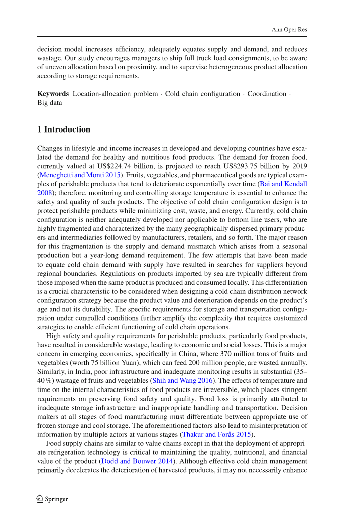 有高度安全和质量要求的易腐产品,尤其是食品,已经造成相当大的浪费,这导致经济和社会损失。这是新兴经济体中的一个主要问题,特别是在中国,其中3亿7000万吨水果和蔬菜(价值750亿元),可养活2亿人,但是每年都被浪费。同样,在印度,基础设施差和监测不足导致大量(35-40%)水果和蔬菜的浪费(Shih和Wang 2016)。温度和时间对食品的内部特性的影响是不可逆的,这对保持食品安全和质量提出了严格的要求。食物损失主要归因于仓储基础设施不完善和装卸搬运不当。所以在食品制造的各个阶段,决策者必须区分冷冻储存和冷藏的恰当使用。上述因素也会导致多个参与者在不同阶段的信息误解(Thakur和aring;S 2015)。
