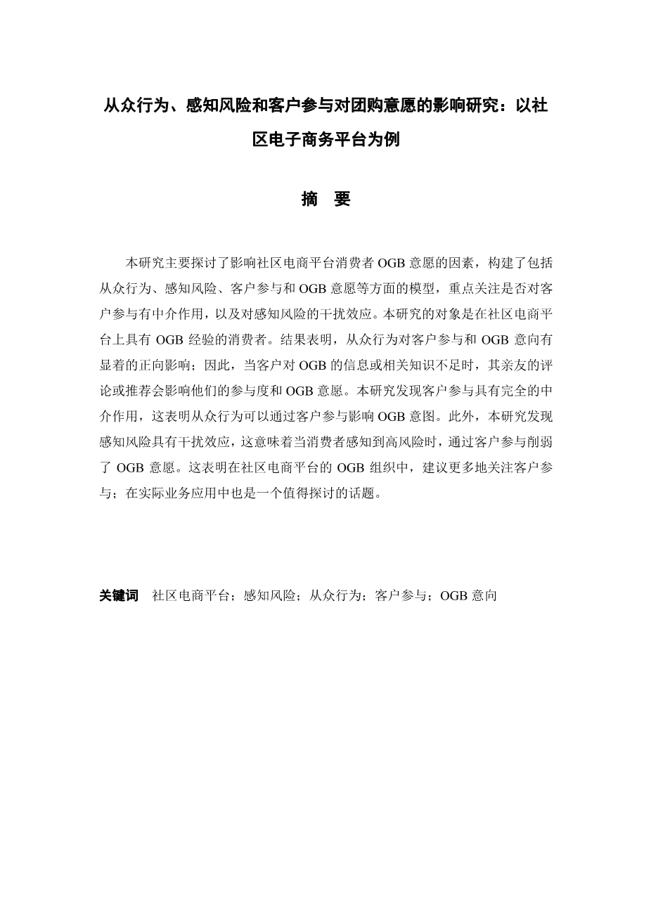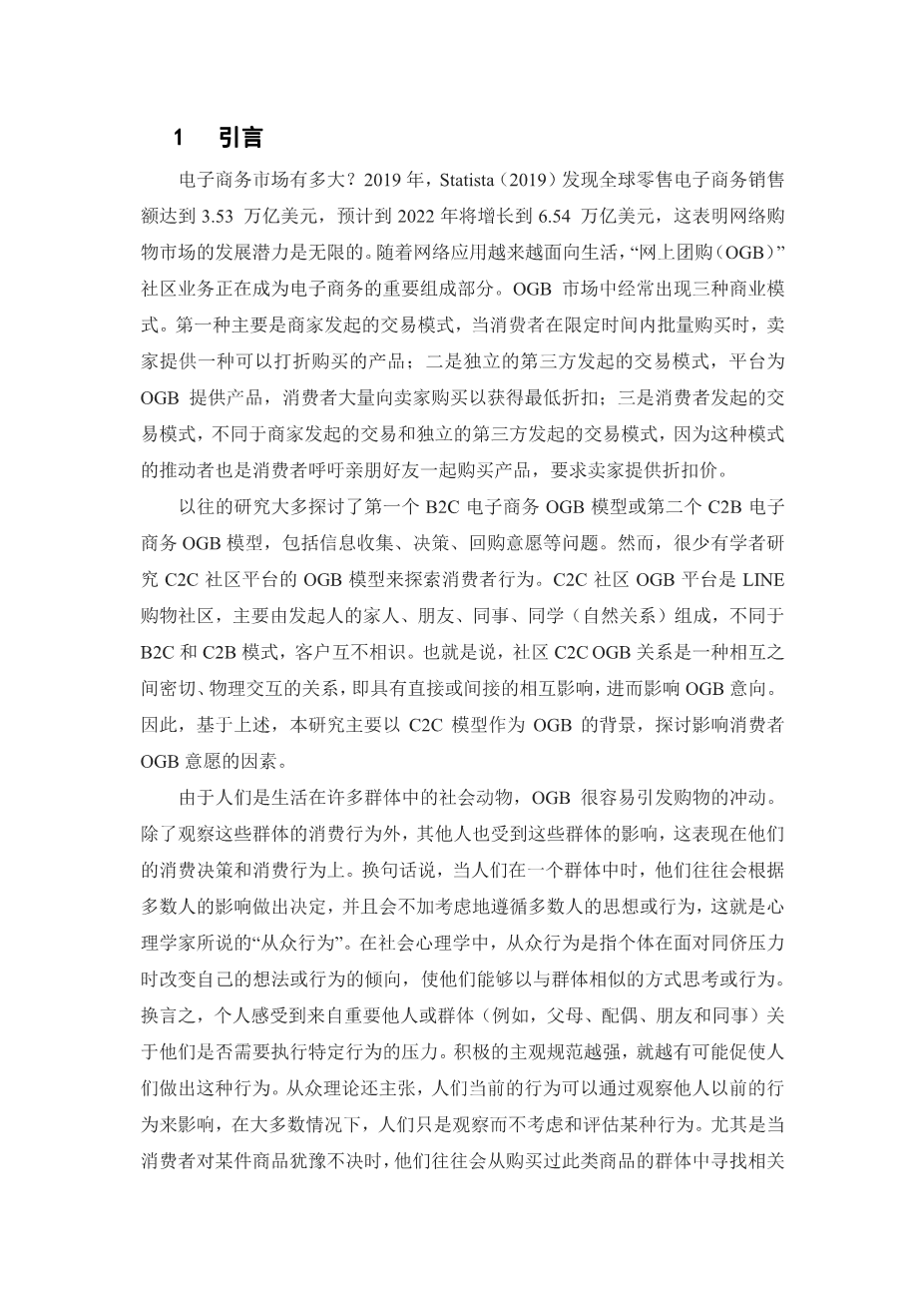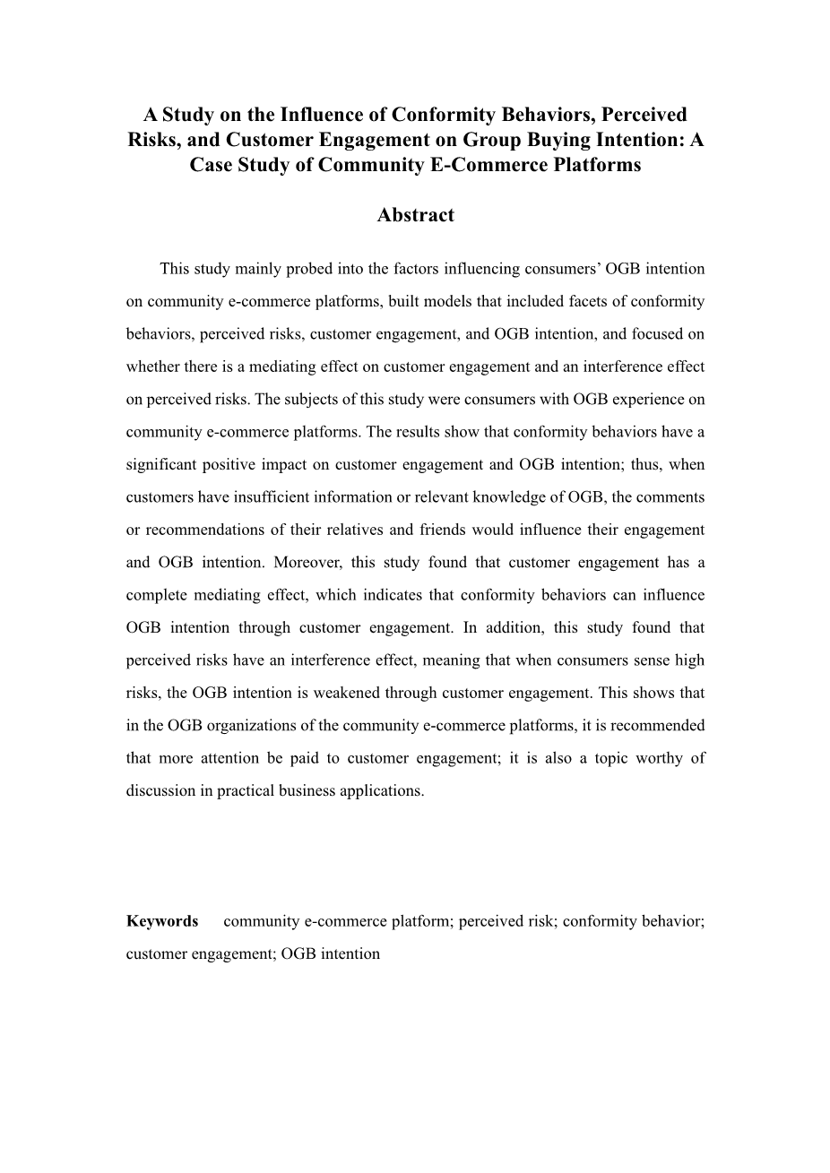 从众行为、感知风险和客户参与对团购意愿的影响研究:以社区电子商务平台为例外文翻译资料 2023-04-18 11:52:02 英语原文共 28 页,剩余内容已隐藏,支付完成后下载完整资料 英语译文共 21 页,剩余内容已隐藏,支付完成后下载完整资料 资料编号:[588812],资料为PDF文档或Word文档,PDF文档可免费转换为Word 您需要先支付 30元 才能查看全部内容!立即支付 发小红书推广免费获取该资料资格。点击链接进入获取推广文案即可: Ai一键组稿 | 降AI率 | 降重复率 | 论文一键排版 PREVIOUS NEXT 您可能感兴趣的文章 关系契约在跨国供应链中的作用机制研究文献综述 扬子江城市群生态环境脆弱性及其驱动力研究文献综述 生鲜品冷链物流运作模式调研与改进研究文献综述 基于HAZOP-LOPA方法的冷链物流金融风险分析开题报告 基于服务供应链的港口服务供应商选择评价研究开题报告 民营快递加盟连锁模式研究——以圆通速递为例开题报告 共享经济下的供应链运作模式研究开题报告 基于拉格朗日松弛的运输调度问题求解文献综述 供应链中供需协调策略及价格折扣订货模型研究文献综述 生态供应链创新 绩效分析:一个案例开题报告