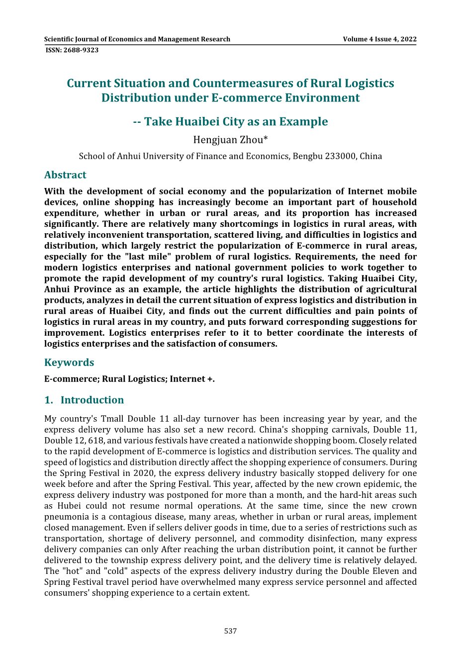 各部门都致力于营造物流发展环境,完善物流基础设施建设,为我国物流业的发展提供支持 和保障,特别是关注我国农村物流市场的现代企业,不断推动电子商务和物流配送向高质量 、高速、更便捷地发展,以更好地适应农村物流的发展状况,解决农村电子商务和物流发展 的问题。然而,现阶段我国农村物流存在的问题,主要是由于农村物流市场发展不足,实施 成本相对较高,无法实现有效的运营。农村物流和配送的缺点尤为突出。以安徽省淮北市为例,分析了淮北市现有物流模式的现状,探讨了阻碍发展的困难和痛点,并结合淮北市区域 发展的现状,更好地培养适合当地居民的物流发展模式。.