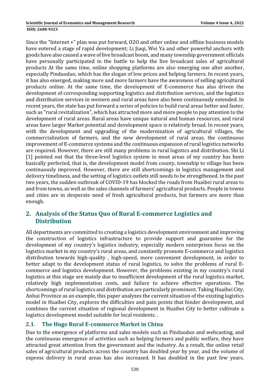 自“互联网 ”计划提出以来,O2O等线上线下商业模式进入快速发展阶段;李嘉琪、魏雅等 强大的商品主播也掀起了一波直播热潮,许多乡镇政府官员亲自参与了帮助农产品直播销售 的同时,网上购物平台也相继涌现,尤其是拼多多,它有低价帮助农民的口号。近年来,它 也出现了,使越来越多的农民意识到在网上销售农产品。同时,电子商务的发展也推动了相 应的配套物流配送服务的发展,西部和农村地区的物流配送服务也在不断扩大。近年来,国 家提出了一系列加快农村建设的政策,如“农村振兴” ,吸引越来越多的人关注农村发展。 农村地区拥有独特的自然资源和人力资源,农村地区的市场潜力较大,发展空间相对广阔。 近年来,随着农业村现代化的发展和升级、农民的商业化和农村地区的新发展,需要电子商 务系统的不断完善和农村物流网络的不断扩大。然而,在农村物流和配送方面仍存在诸多问 题。ShiLi[1]指出,我国大部分地区的三级物流体系已经基本完善,即从县、乡到村的发展 模式不断完善。但在物流管理和配送及时性方面仍存在不足,物流网点的设置仍需加强。过 去两年,新冠肺炎疫情的突然爆发,封锁了淮北农村地区进出城镇的道路,以及农民农产品 的销售渠道。城镇和城市里的人们急需新鲜的农产品,但农民已经足够了。