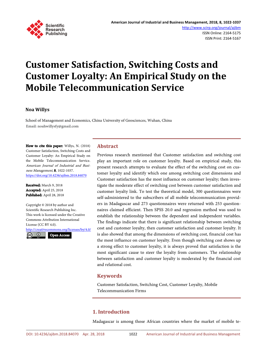 本文试图考察转换成本在激烈竞争市场中的作用,比较客户满意度和转换成 本对客户忠诚度的影响。这项研究的结果将有助于对转换成本和客户满意度的营销文献有一个新的理解。本研究的独创性在于,它是第一次研究马达加斯加等发展中国家移动电信服务中交换成本、客户满意度和客户忠诚度之间的关系。因此,这些结果可以用来帮助马达加斯加的电信管理人员有更好的战略来保持他们的客户忠诚。尽管它作出了贡献,但它也有局限性;由于数据收集过程中的时间和资源限制;马达加斯加北部的样本量有限,缩小了,不能完全代表该国的人口。 本研究分为六章,包括绪论、文献综述和假设、研究设计、数据分析、结论和管理意义。