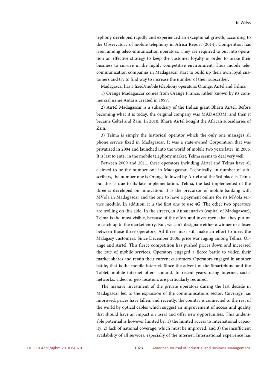 马达加斯加是移动电话市场的非洲国家之一,根据非洲移动电话观察站的报告(2014年),乐调发展迅速,并经历了特殊的增长。 电信运营商之间的竞争加剧。 他们必须实施一种有效的战略,以保持客户的忠诚度,使他们的业务在高度竞争的环境中生存。 因此,马达加斯加的移动电信公司开始建立自己的忠实客户,并设法增加其用户数量。 马达加斯加有3个固定/移动电话运营商:Orange、Airtel和Telma。