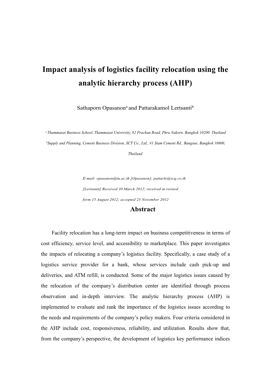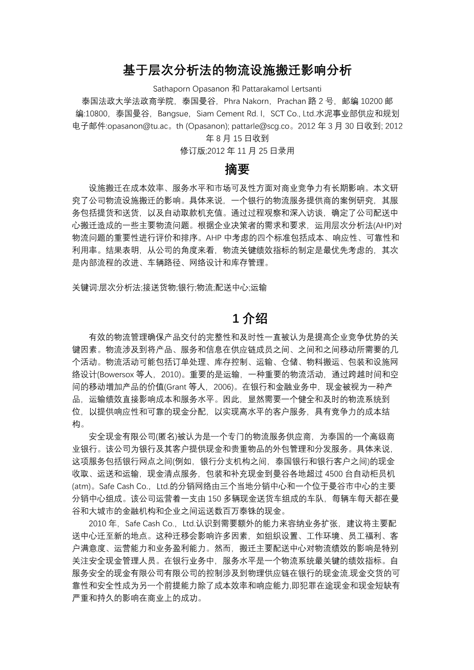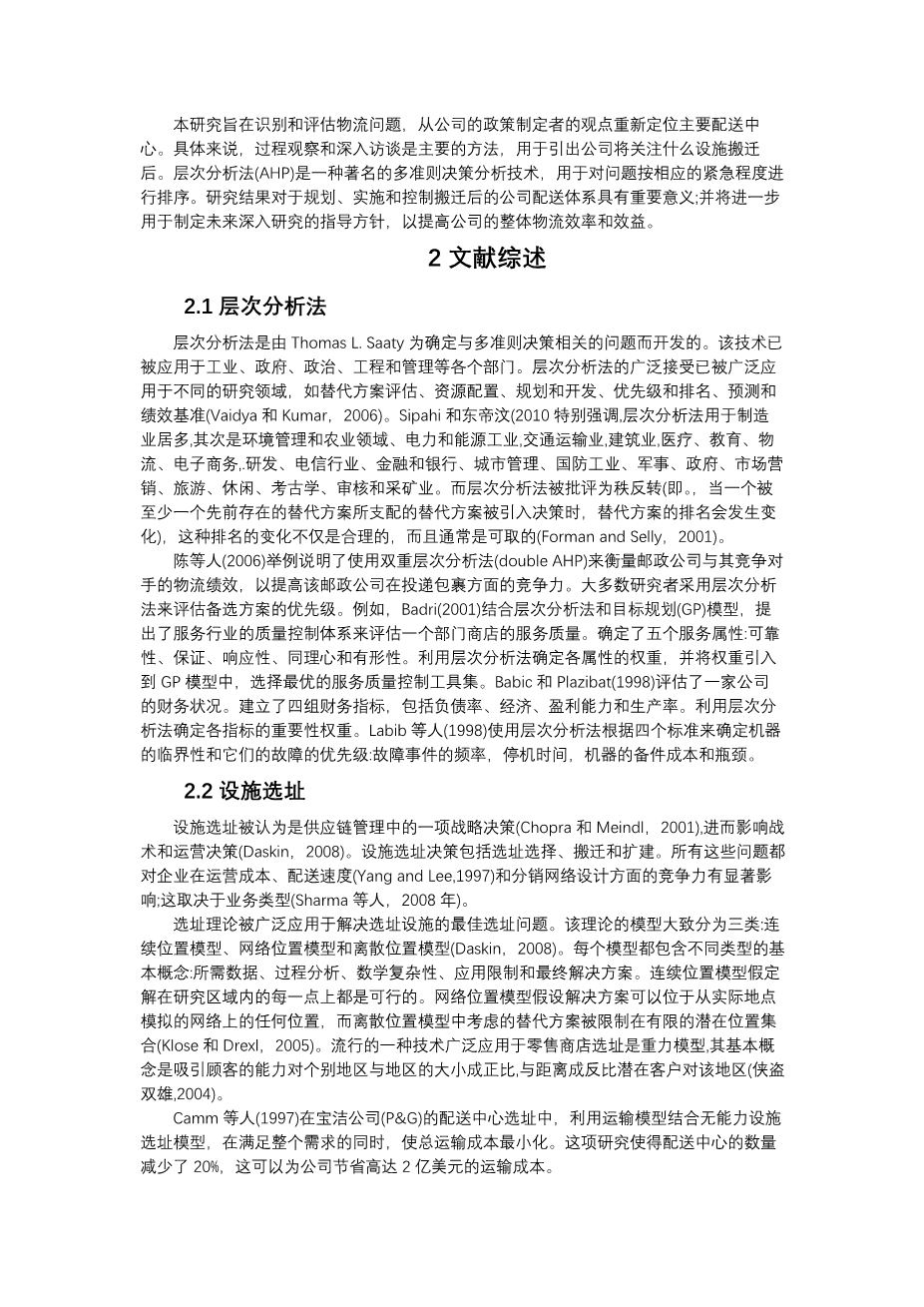 基于层次分析法的物流设施搬迁影响分析外文翻译资料 2023-07-22 16:02:51 英语原文共 28 页,剩余内容已隐藏,支付完成后下载完整资料 英语译文共 11 页,剩余内容已隐藏,支付完成后下载完整资料 资料编号:[605324],资料为PDF文档或Word文档,PDF文档可免费转换为Word 您需要先支付 30元 才能查看全部内容!立即支付 发小红书推广免费获取该资料资格。点击链接进入获取推广文案即可: Ai一键组稿 | 降AI率 | 降重复率 | 论文一键排版 PREVIOUS NEXT 您可能感兴趣的文章 关系契约在跨国供应链中的作用机制研究文献综述 扬子江城市群生态环境脆弱性及其驱动力研究文献综述 生鲜品冷链物流运作模式调研与改进研究文献综述 基于HAZOP-LOPA方法的冷链物流金融风险分析开题报告 基于服务供应链的港口服务供应商选择评价研究开题报告 民营快递加盟连锁模式研究——以圆通速递为例开题报告 共享经济下的供应链运作模式研究开题报告 基于拉格朗日松弛的运输调度问题求解文献综述 供应链中供需协调策略及价格折扣订货模型研究文献综述 生态供应链创新 绩效分析:一个案例开题报告